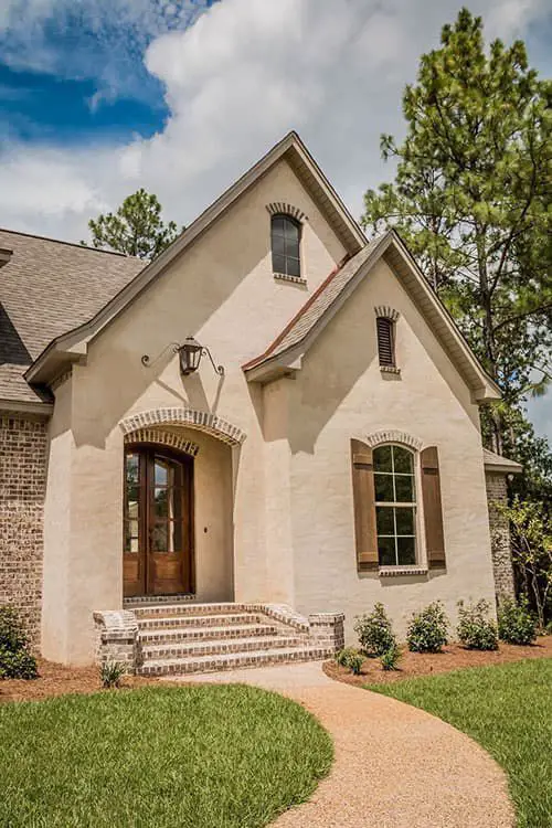 This French country design delivers around 2,399 sq ft of heated living space with a bonus room (~364 sq ft) above the garage. It offers flexible 3- or 4-bedroom options, 2 full baths plus 1 half bath, and graceful exterior features like arched entryways and steep rooflines. 1