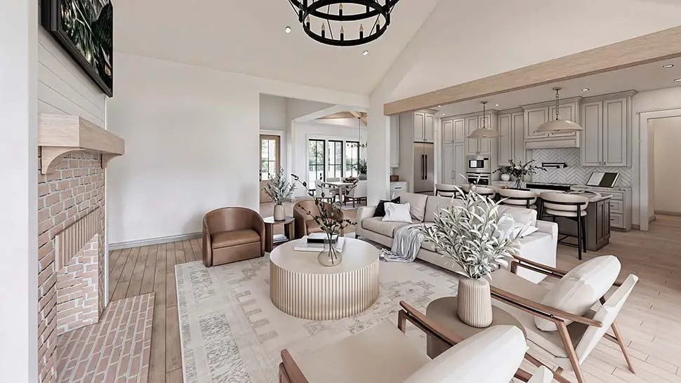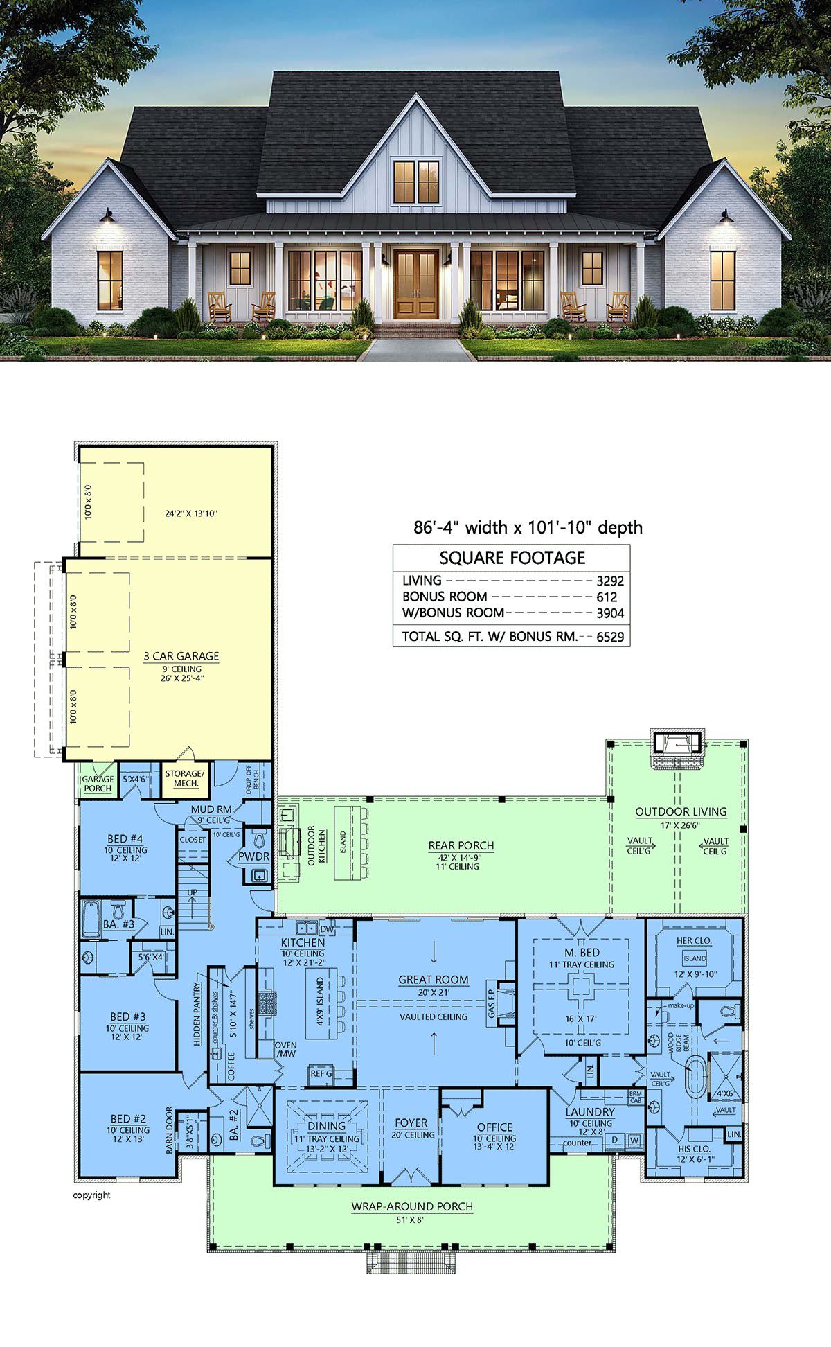 This southern-style farmhouse offers about 3,292 sq ft of elegant living on one level, with a bonus area upstairs.