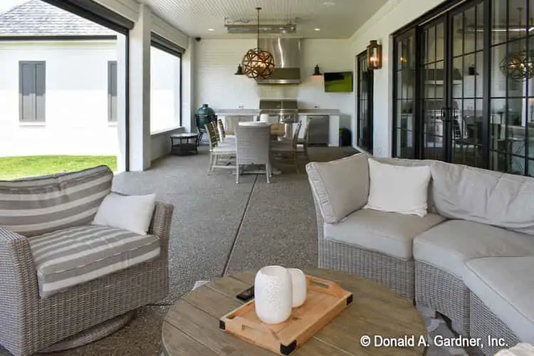 It’s wide and deep, providing a sheltered outdoor room you’ll actually use. French doors and large windows connect it gracefully to the interior living zones.