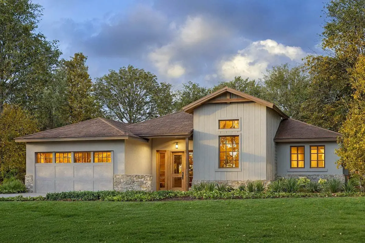 The façade mixes horizontal siding with stone base accents and low-slung proportions, nodding to classic Prairie aesthetic. A front porch greets you gently, hinting at balance and calm before you step inside.