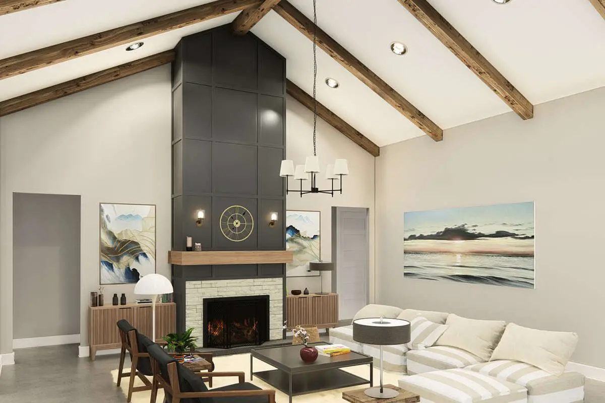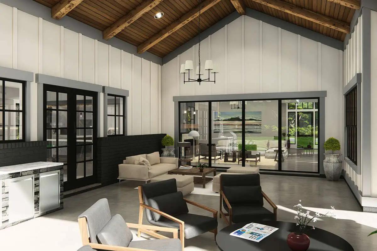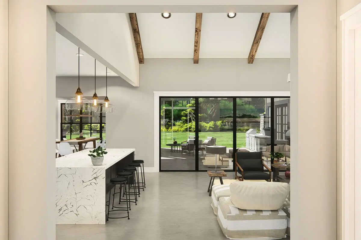 The great room sits at the heart of the plan, anchored by a fireplace and flanked by built-ins. It flows into the dining and kitchen zones, with large windows or doors opening toward the rear porch to bring in light and view. 2