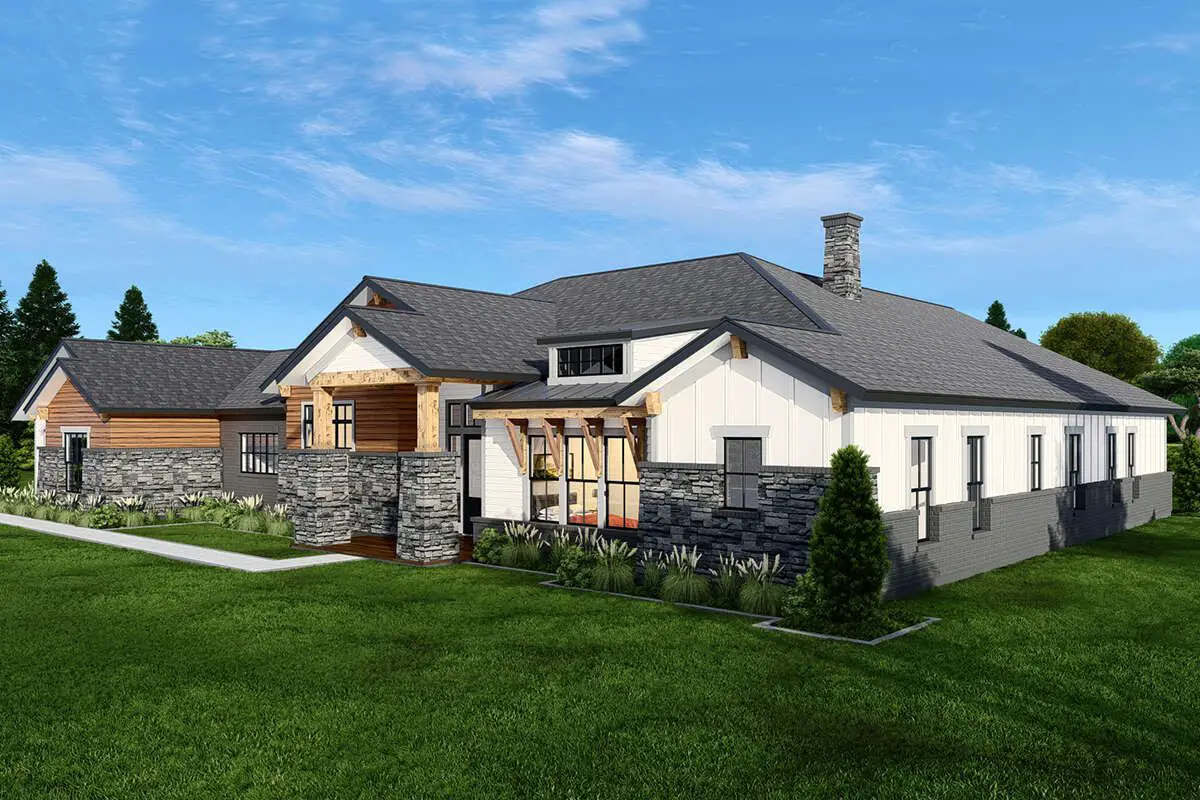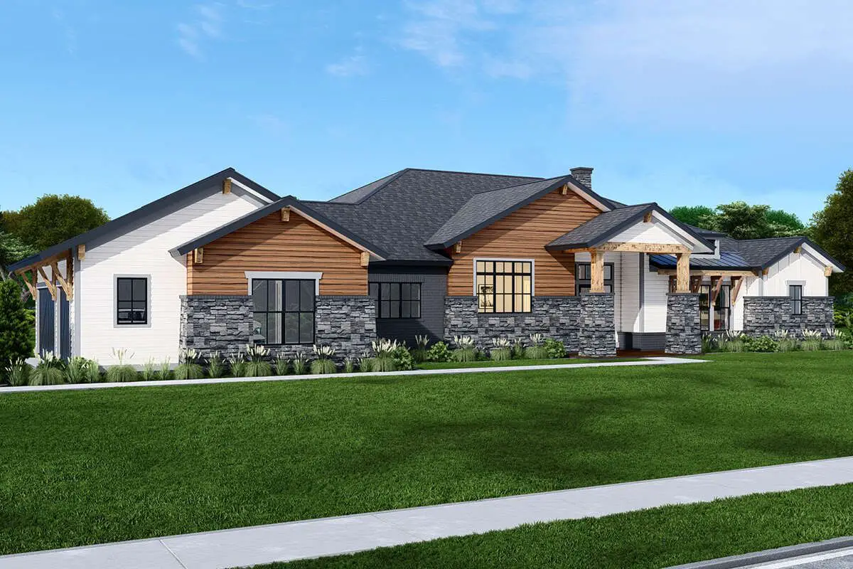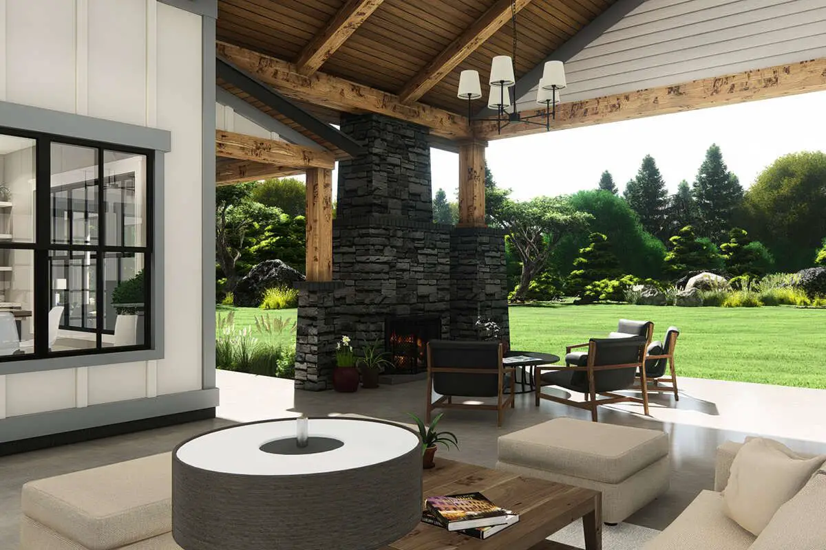 With wide gables, deep overhangs, mixed siding textures, and a prominent covered front porch, this home projects both warmth and structure. The rear also includes a covered space opening to a large outdoor living area. 1