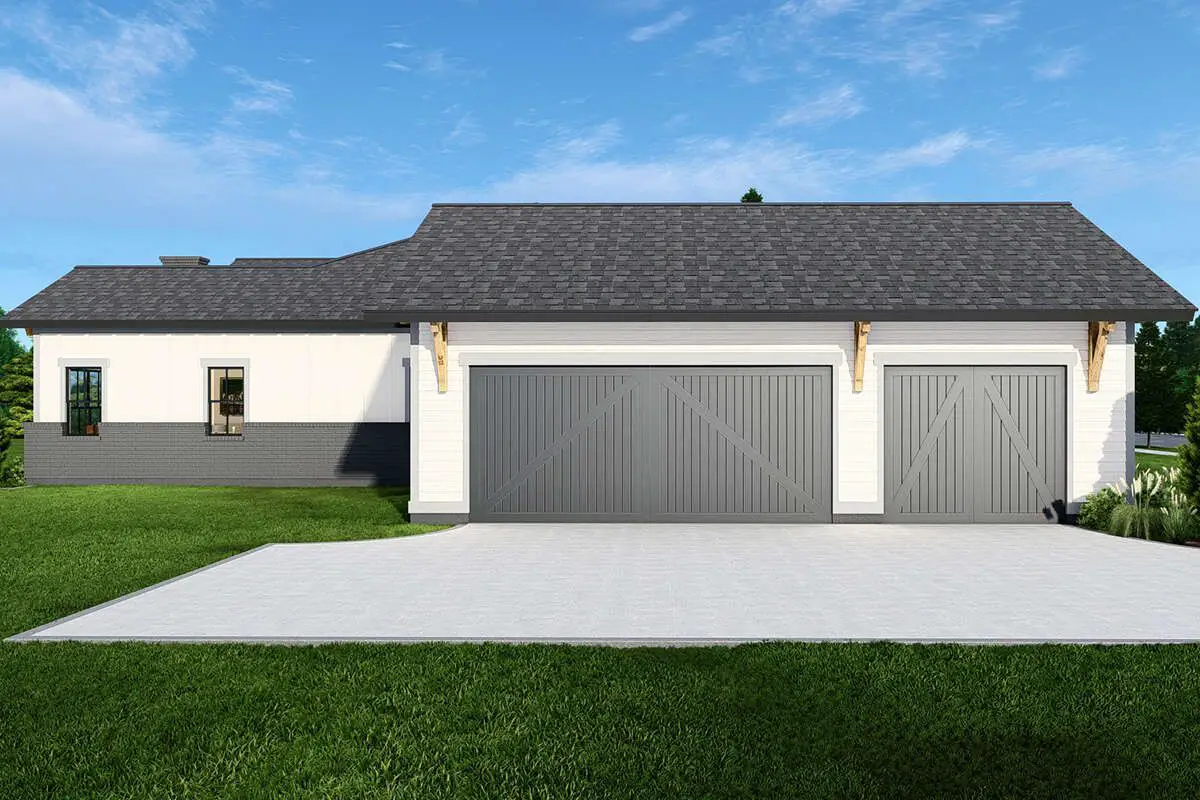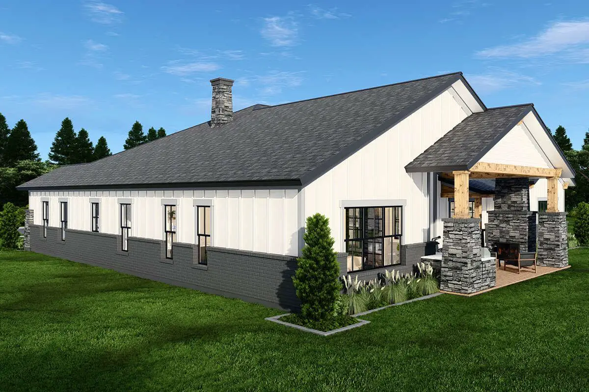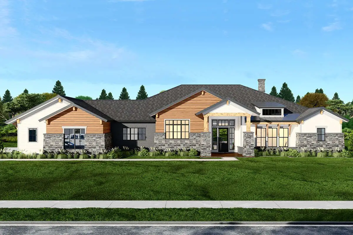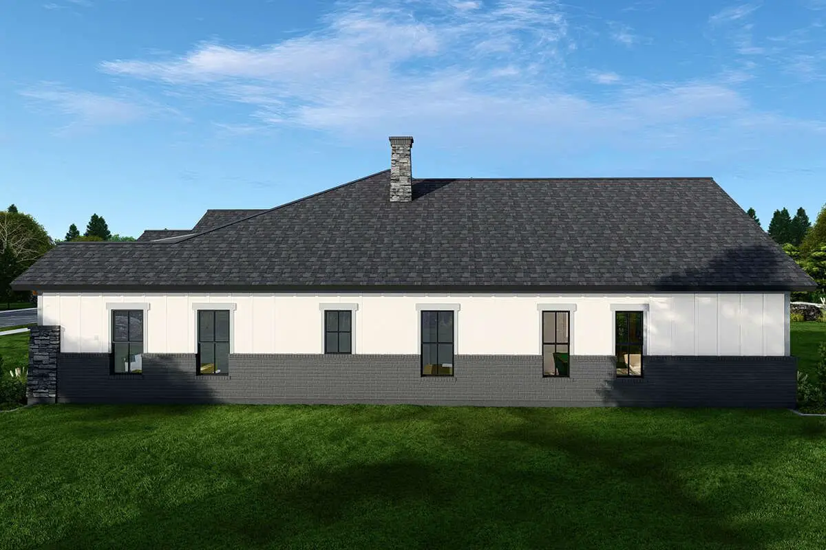 With wide gables, deep overhangs, mixed siding textures, and a prominent covered front porch, this home projects both warmth and structure. The rear also includes a covered space opening to a large outdoor living area. 1