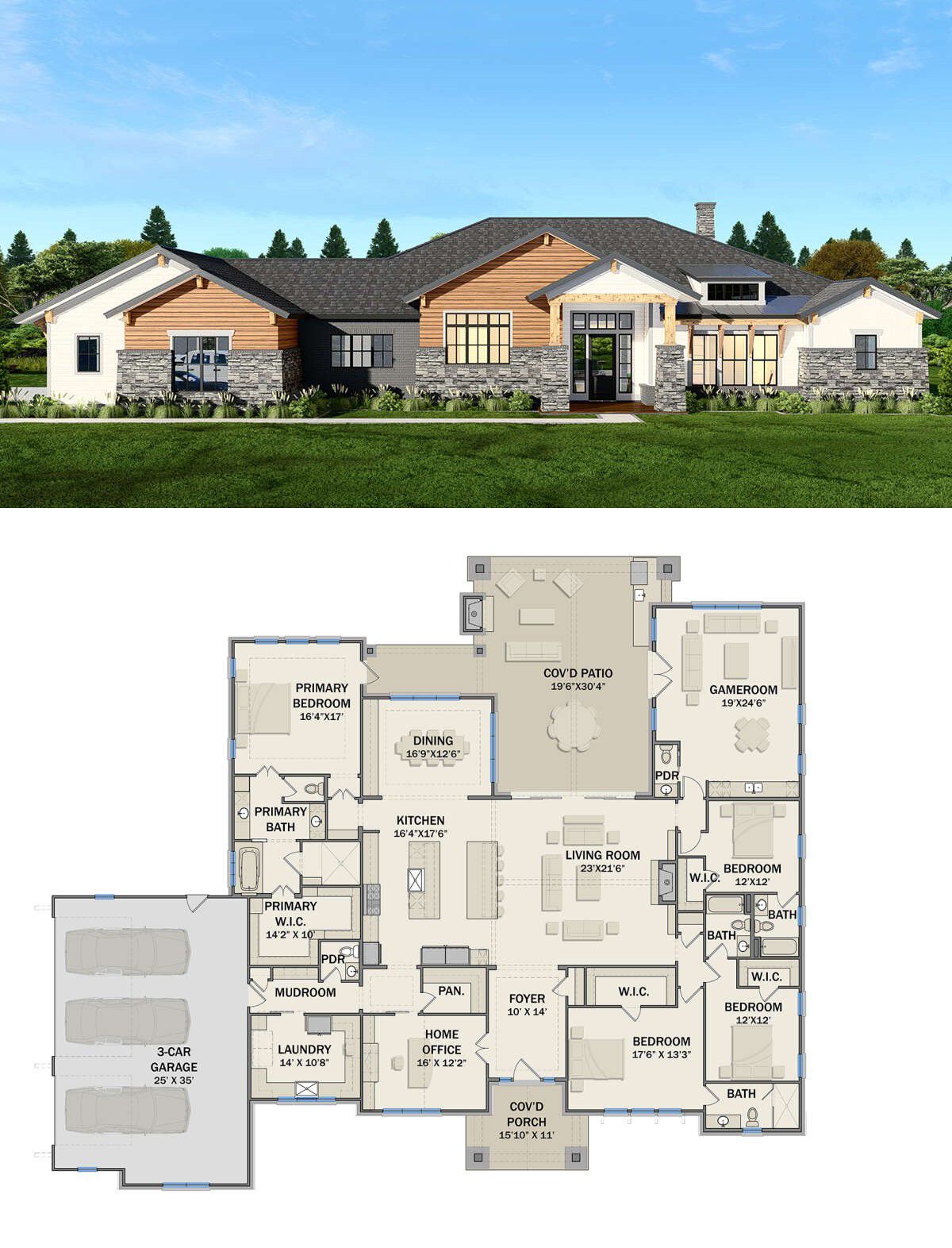The design blends strong craftsman character and generous functional spaces—think covered porches, media room, office, and front/rear indoor-outdoor flow.