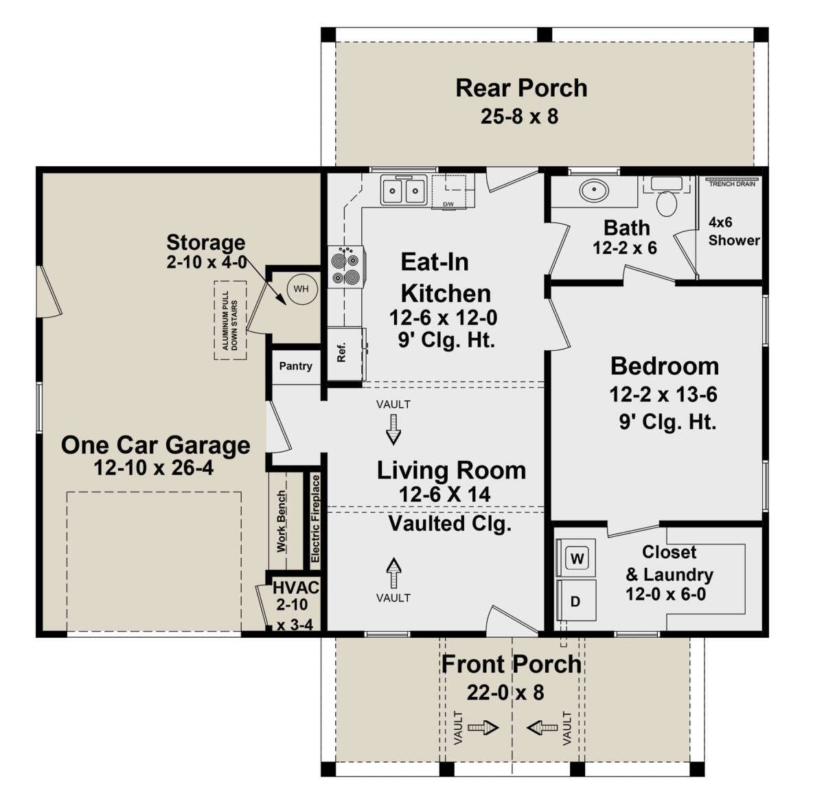 Welcome to a cozy little gem! This modern farmhouse plan gives you **716 square feet** of living space with **1 bedroom** and **1 full bathroom**.