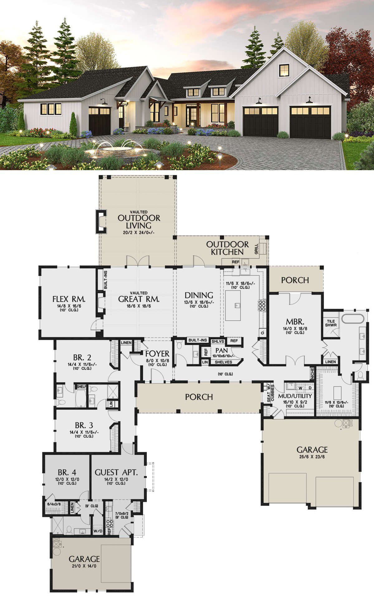 The façade combines board-and-batten siding, dark gutters/trim, and multiple gables for modern farmhouse appeal.