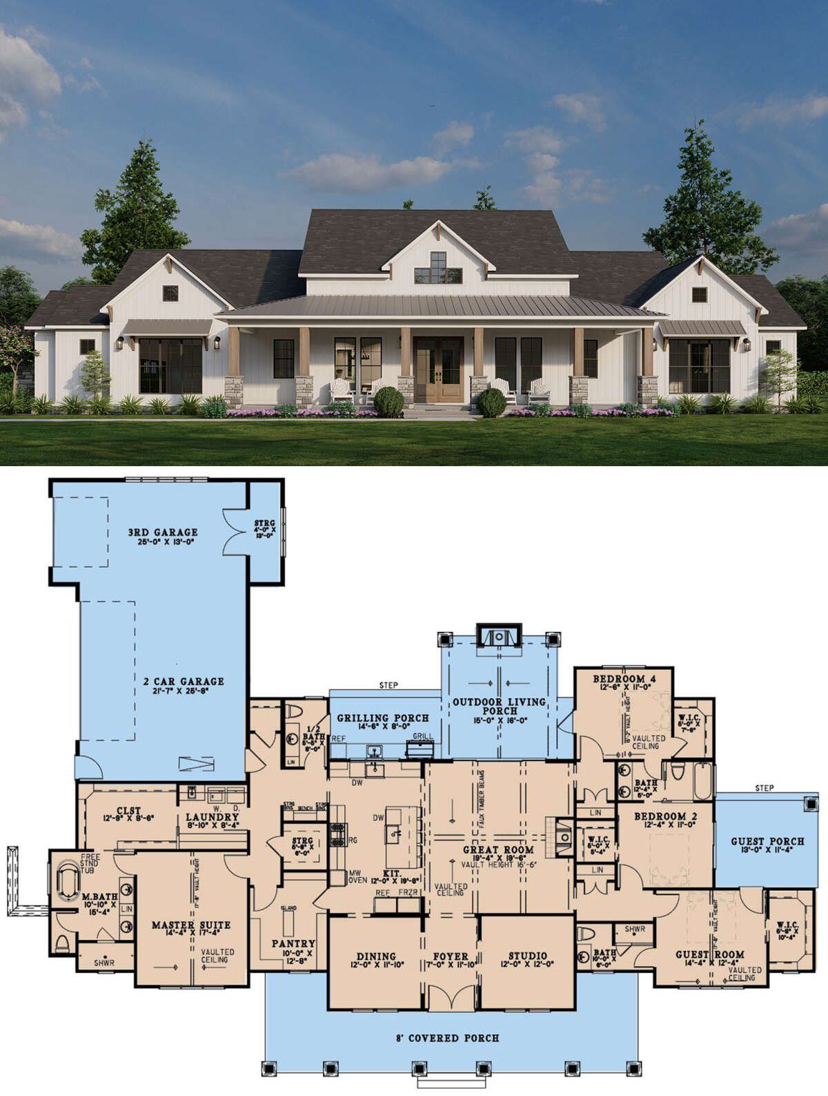 This modern farmhouse design covers about 2,930 sq ft on one level, configured with 4 bedrooms, 3 full bathrooms and 1 half bath.