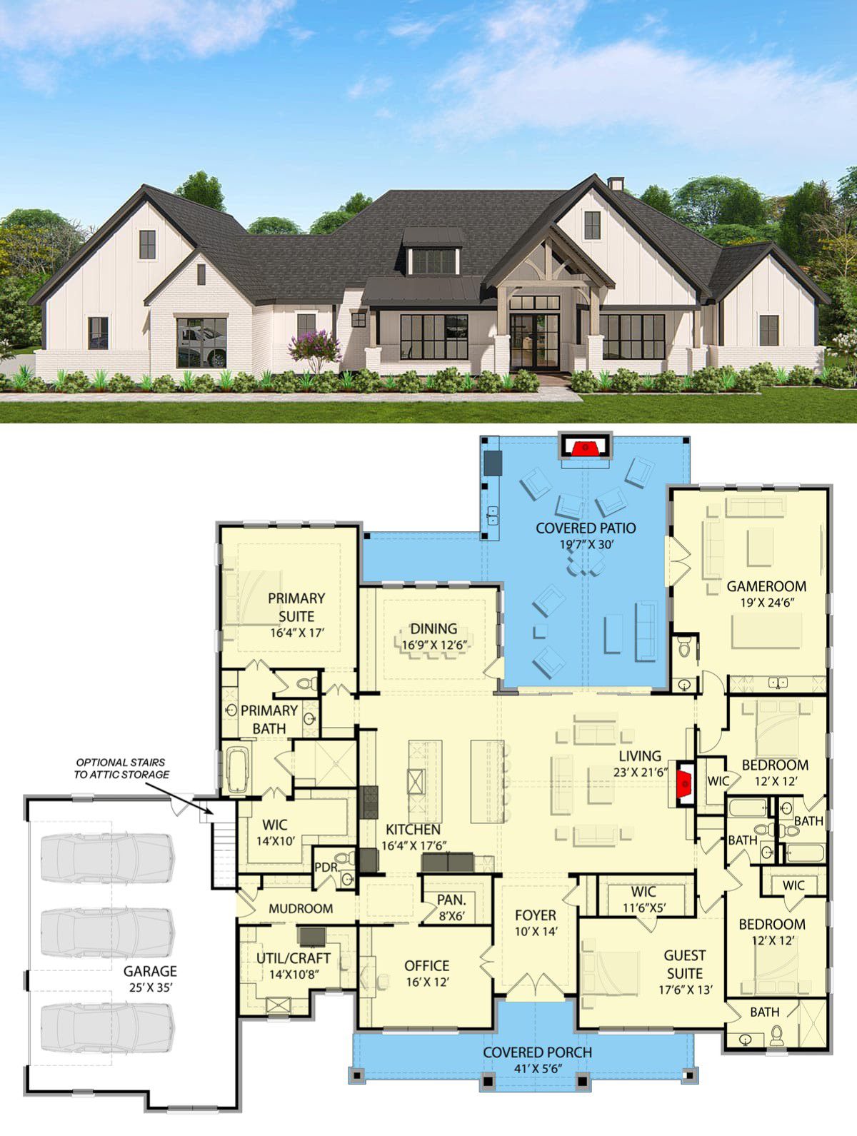 This thoughtfully designed Craftsman-style plan delivers about 4,090 sq ft on a single level, with 4 bedrooms, 4 full baths + 2 half baths, a side-entry 3-car garage, plus highly desirable extras: a **home office**, **game room**, **dual kitchen islands**, and a **vaulted covered patio**. It’s modern, roomy, and built for how families live today.