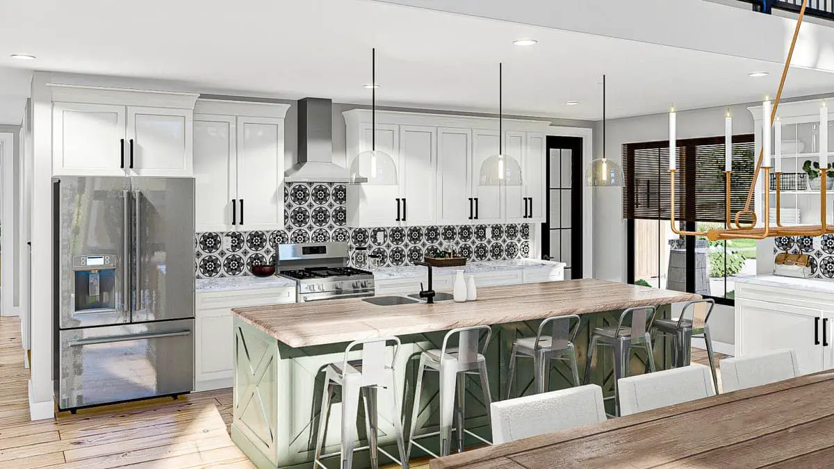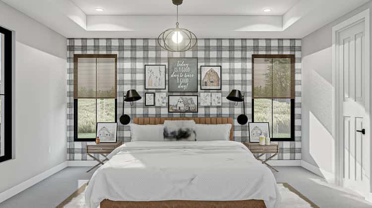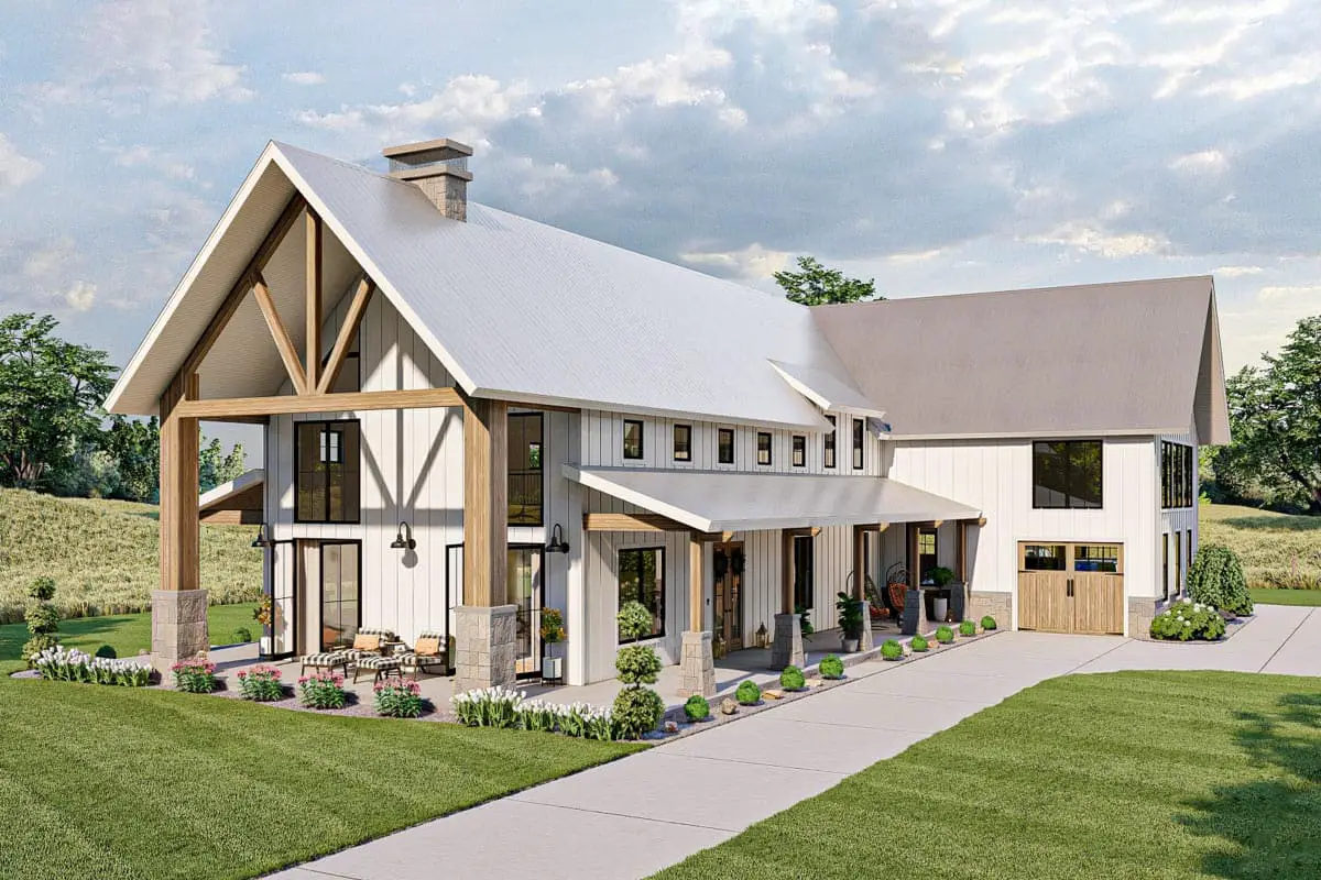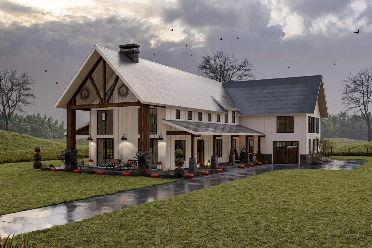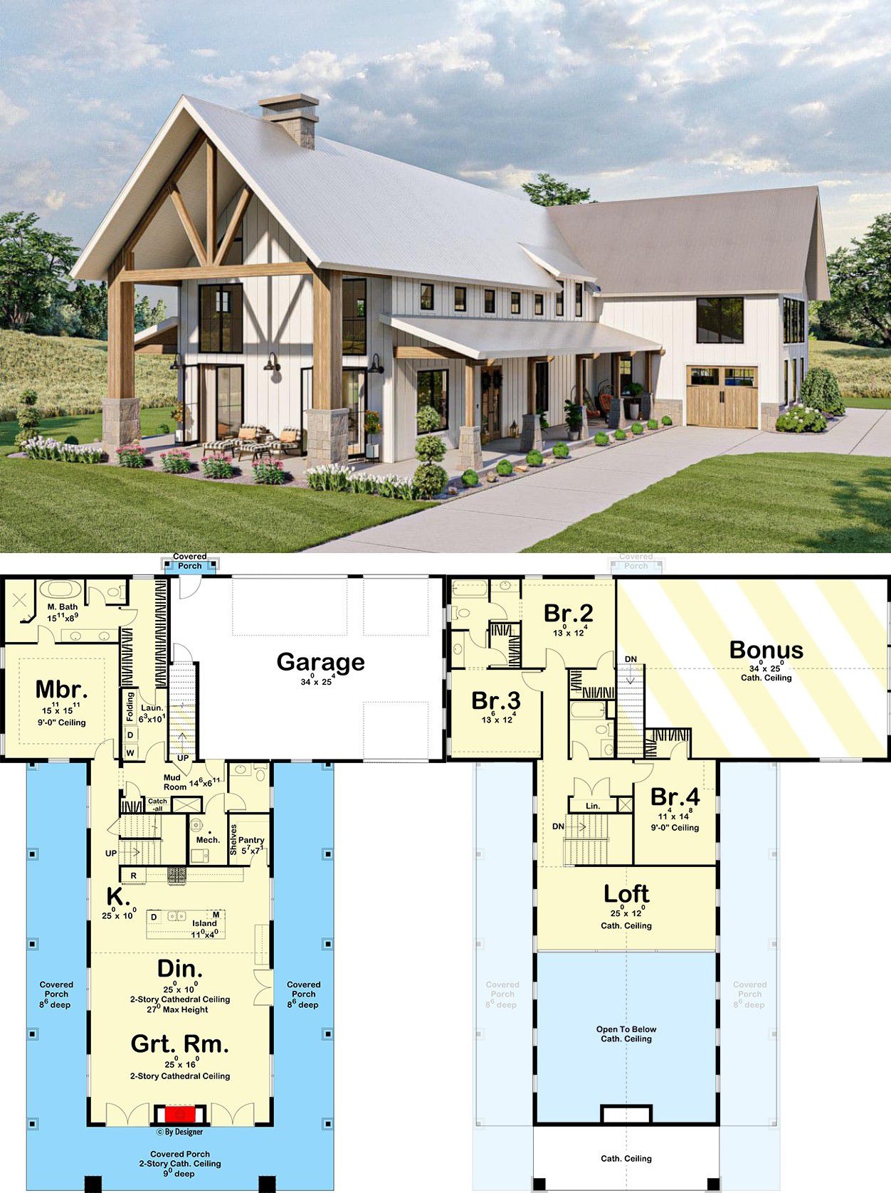 Blending the rustic spirit of a barn with modern farmhouse style, this plan offers around 3,205 sq ft of living space, including 4 bedrooms, 3 full baths + 1 half, and a substantial bonus room over the garage.