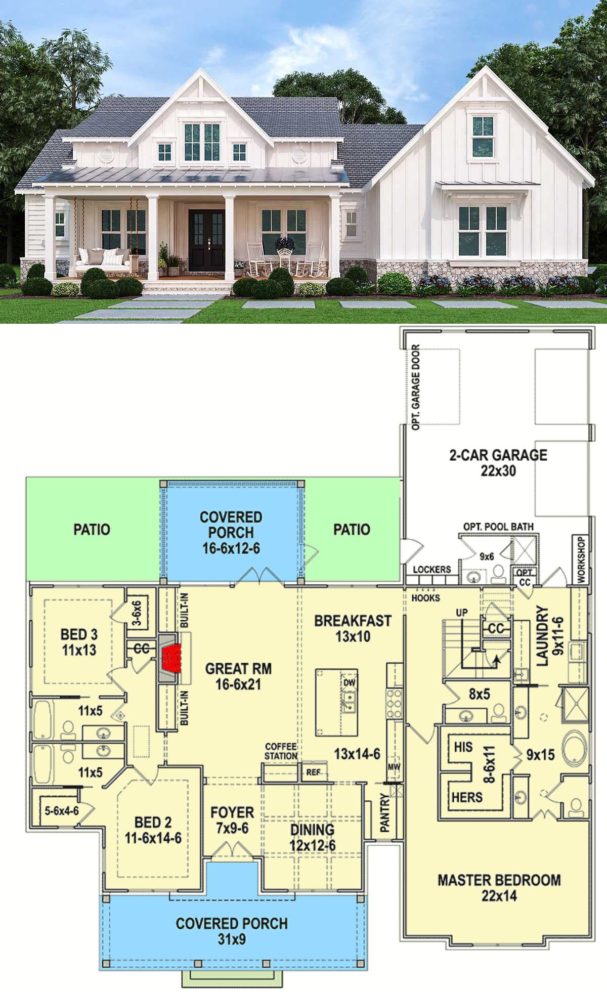 The exterior blends clean modern lines with farmhouse warmth: board-and-batten siding, generous windows, and a welcoming covered front porch.
