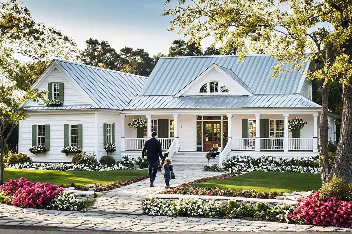 The exterior wraps you in modern farmhouse charm: tall gables, clean white siding, a generous front porch, and a metal roof that catches the light just right. It presents as timeless yet fresh—inviting from day one.