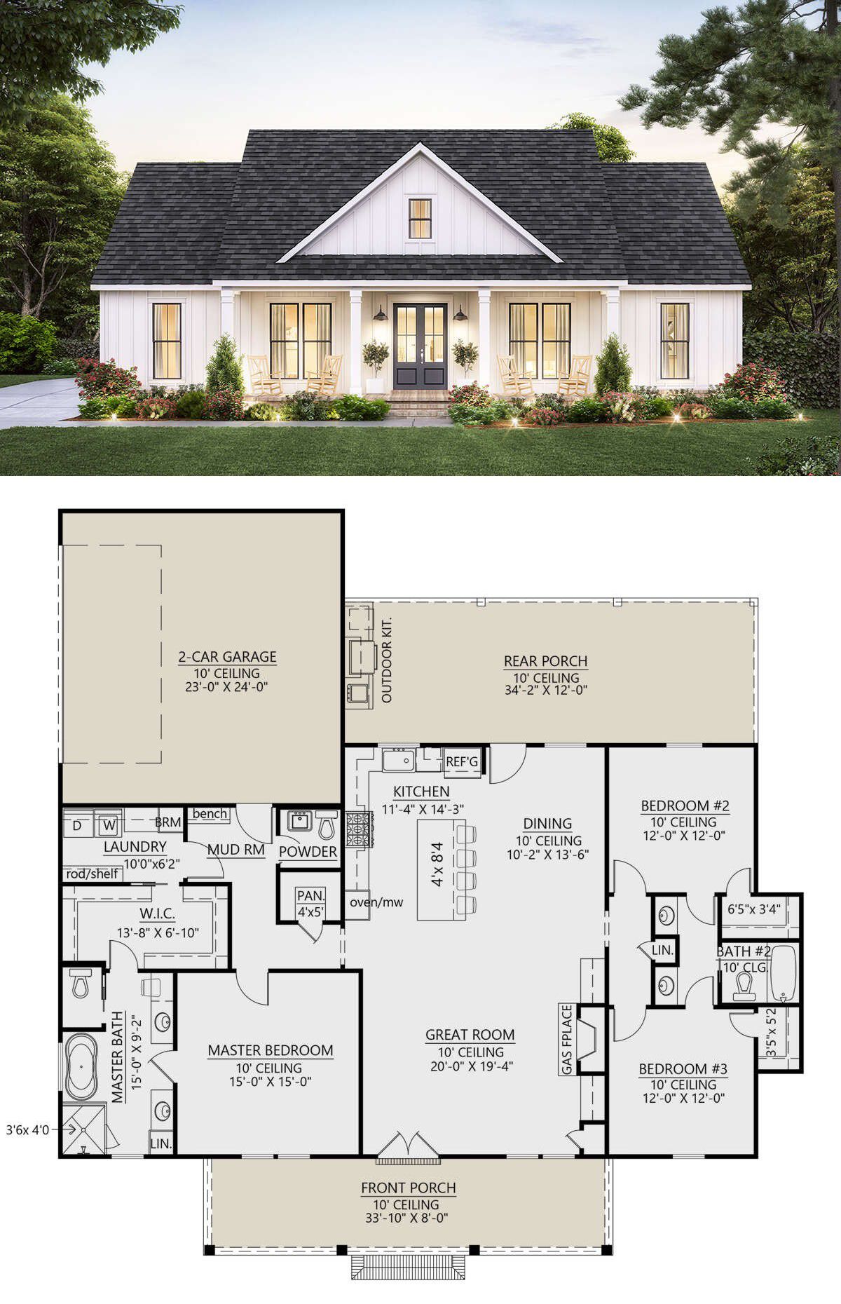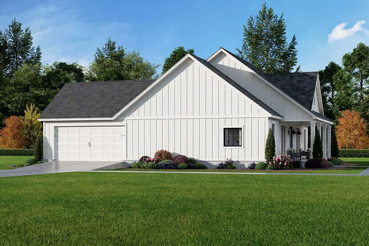 If you’re after modern farmhouse style without going enormous, this design nails it. With approximately 1,924 sq ft of living space, it features 3 bedrooms, 2 full bathrooms and a convenient half bath.