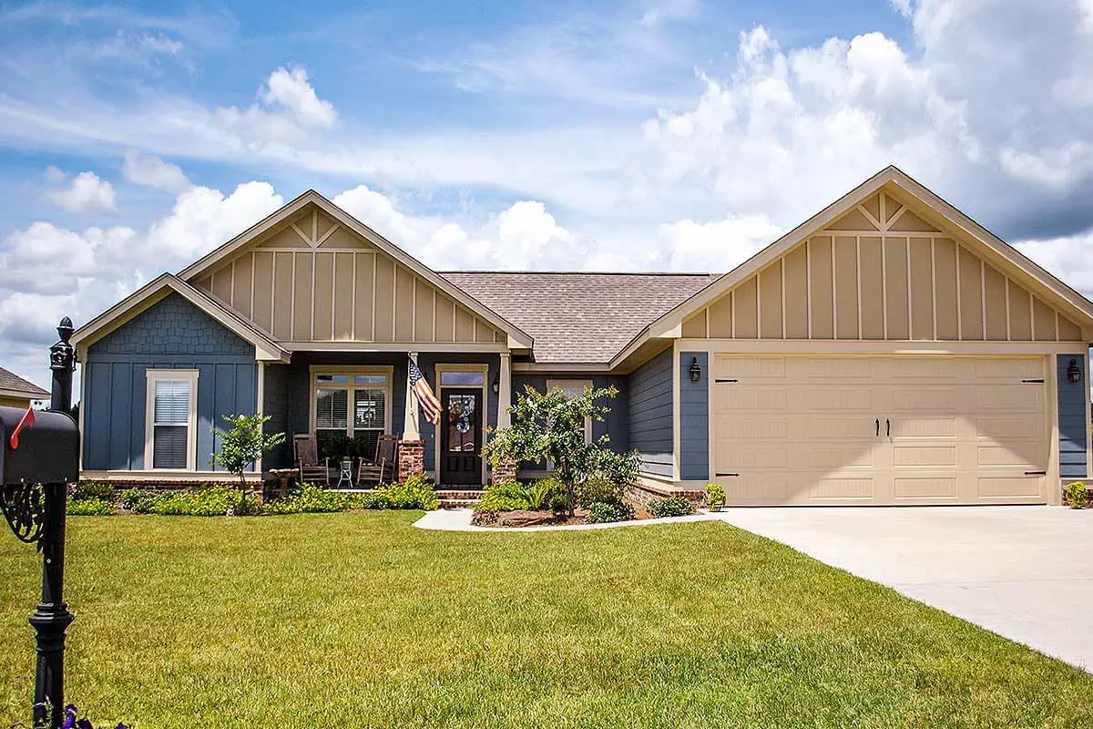 The exterior greets you with classic Craftsman details: gabled rooflines with an 8:12 pitch, exposed rafter tails, mixed siding accents, and porches front and rear that provide both curb appeal and outdoor living without over-building.
