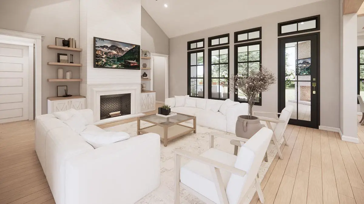 The exterior offers crisp board-and-batten siding, clean white walls, contrasting dark roof and dormers—and a deep covered rear porch with outdoor kitchen and fireplace to complete the farm-to-table vibe. 2