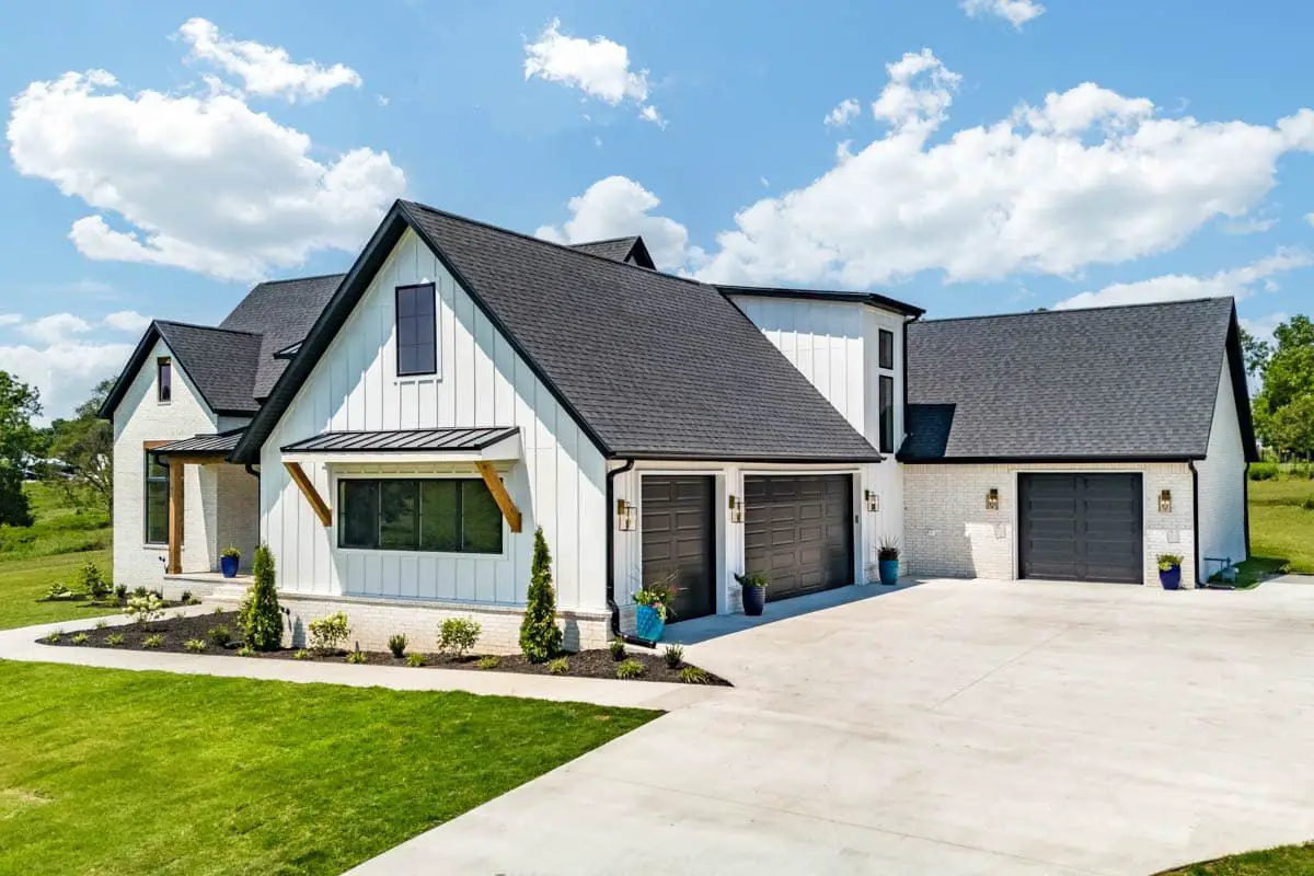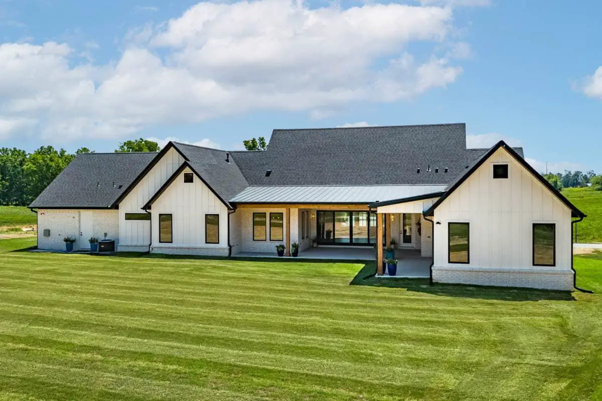 The façade mixes stone and wood accents for a transitional vibe that’s neither ultra-modern nor rustic farm-house cliché.