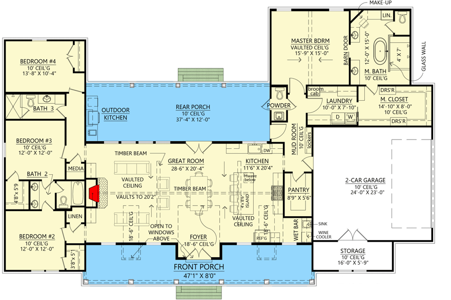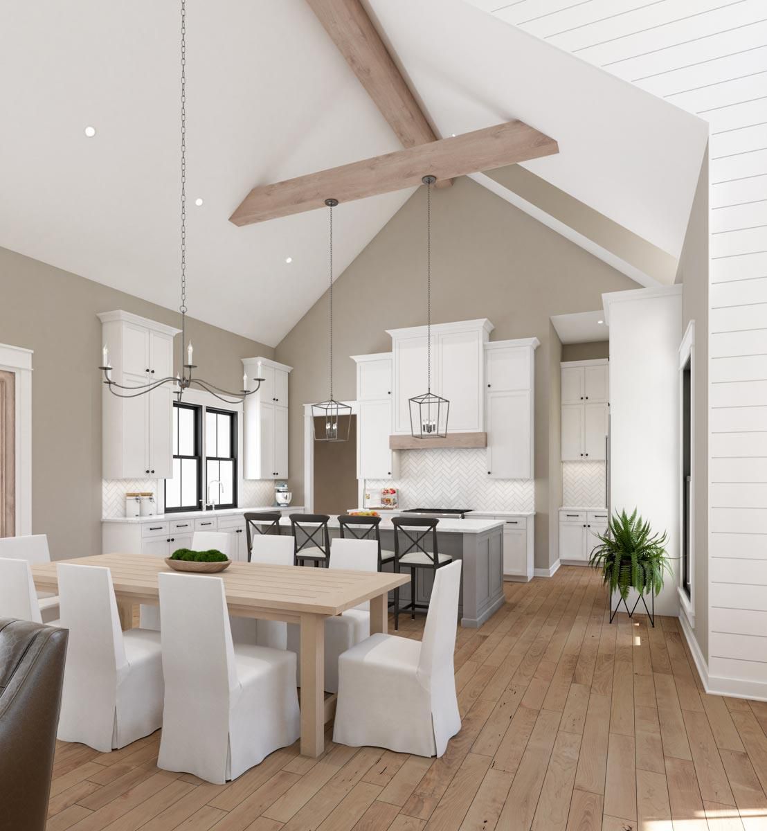 Walk in through French doors into a foyer with soaring ~18′-6″ ceiling and straight into the vaulted great room, where a timber ridge beam spans overhead. The great room opens directly to the back porch with French doors—bringing light, connection, and effortless flow. 4