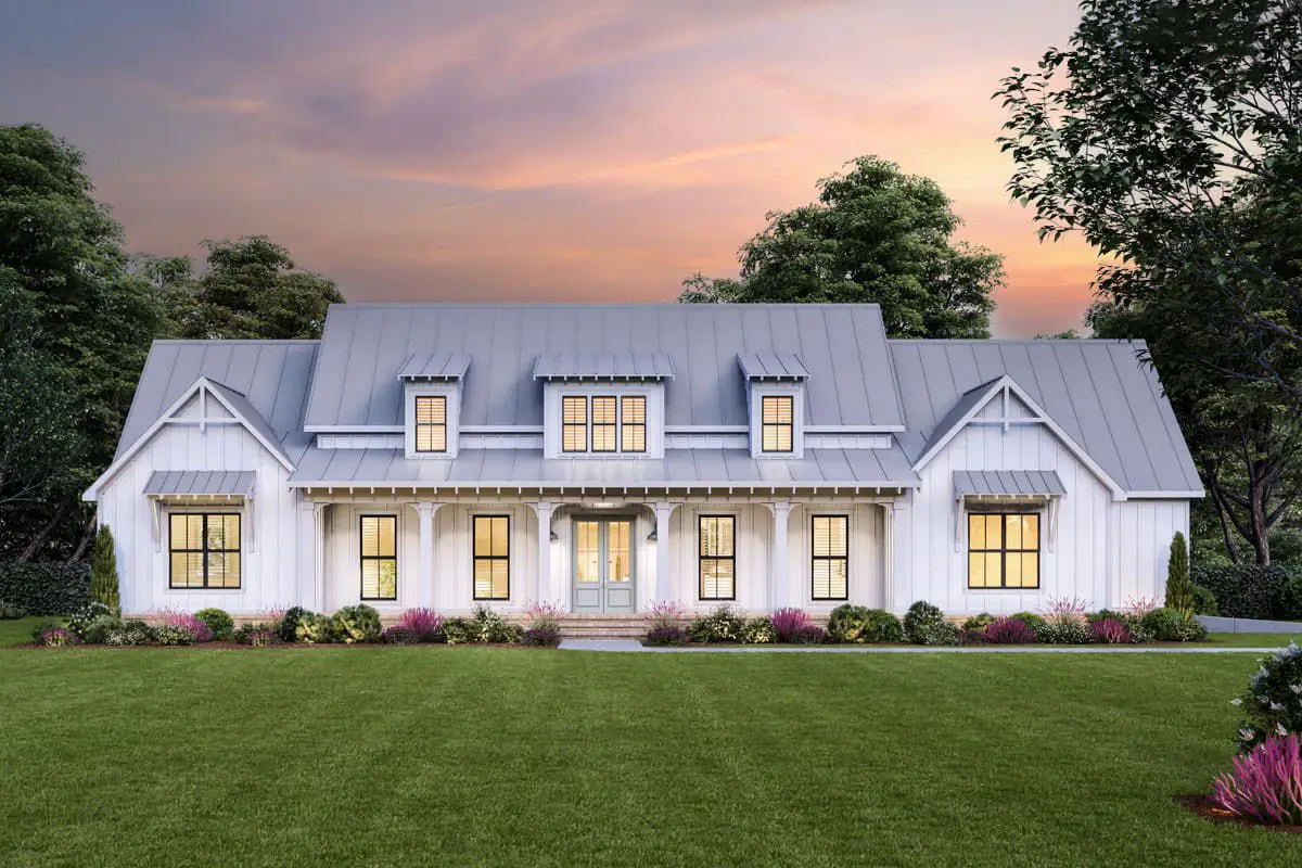 The exterior presents classic modern farmhouse charm: board-and-batten siding, an 8′-deep front porch with exposed rafter tails, and three shed dormers above the porch. All together they lend strong curb presence and welcoming form. 3