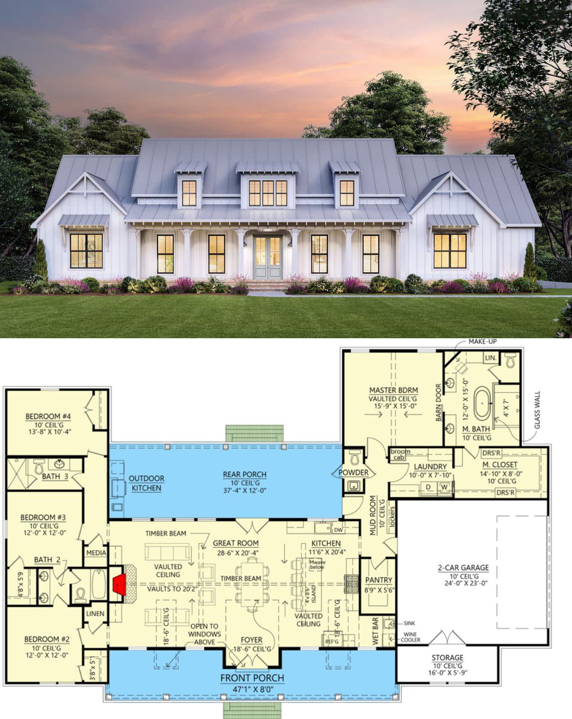 It strikes a perfect balance: modern farmhouse aesthetics without excess, open and vaulted communal spaces that feel grand but live comfortably, and a smart layout that gives both together-space and private-zones. The design anticipates real-life flow—storage, laundry, garage, outdoor access—and blends it into a home you’d be proud to live in for years.