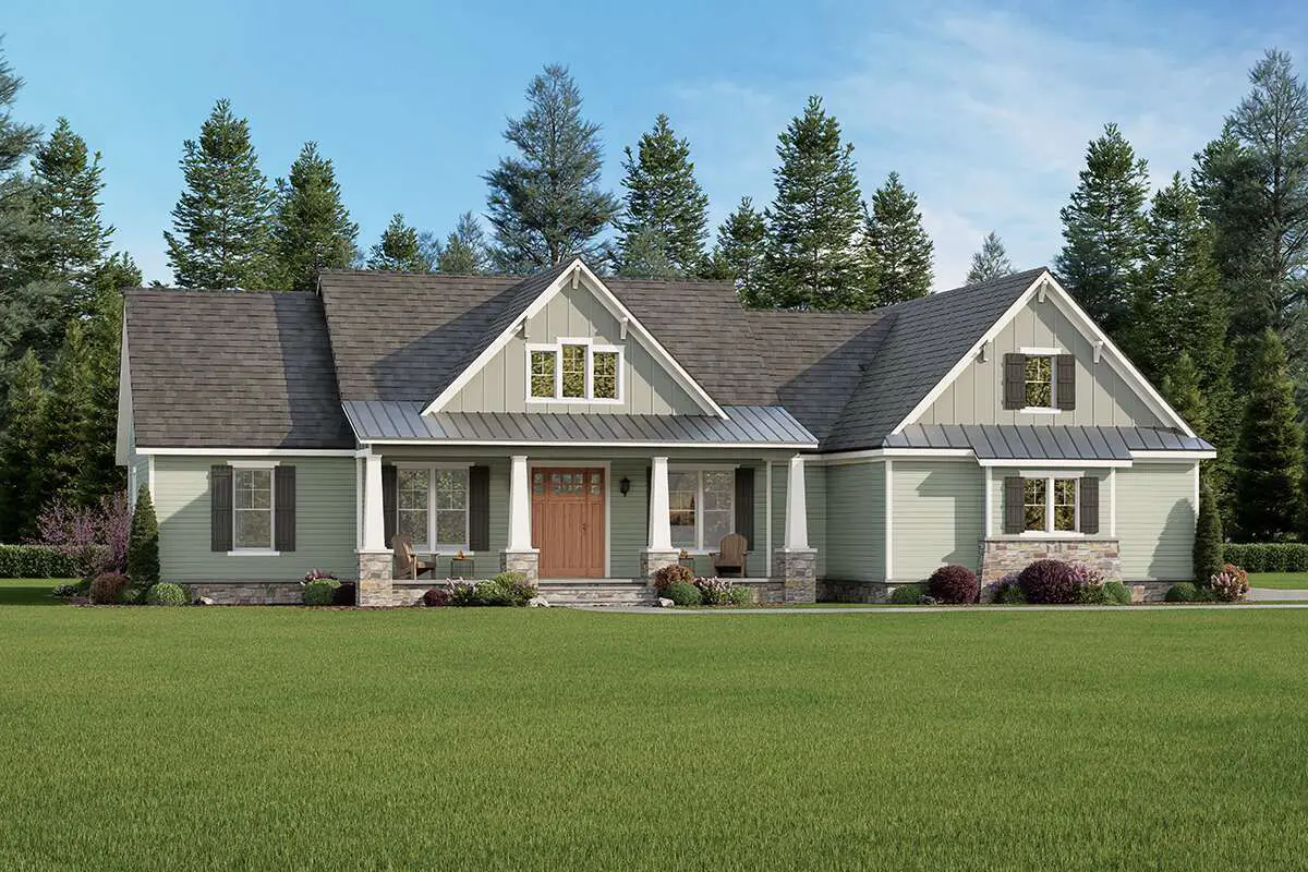 The façade blends tapered stone-pillared porch supports, exposed rafters, and board-and-batten gables into a warm Craftsman statement.