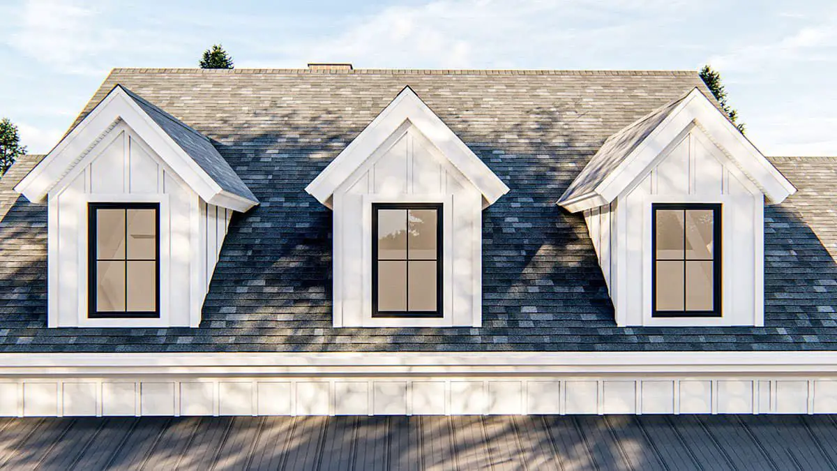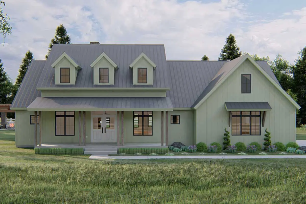 - Farmhouse exterior with modern details—dormers, mixed materials, clean lines—makes for timeless curb appeal.