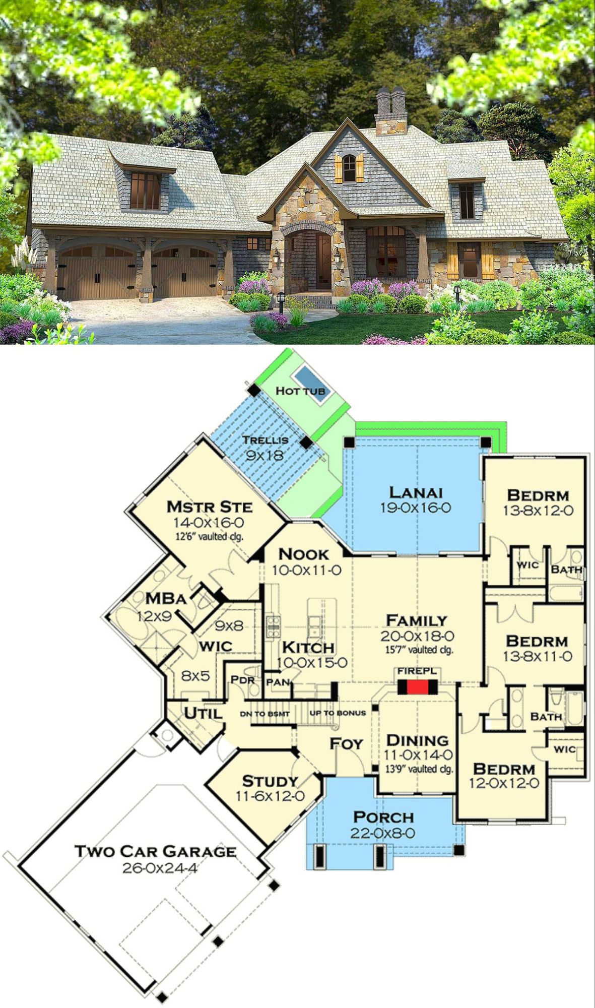 With a steep 12:12 roof pitch, wide eaves, and angled garage set into a 81′ 6″ × 86′ 6″ footprint, this home brings mountain charm without compromising usability.