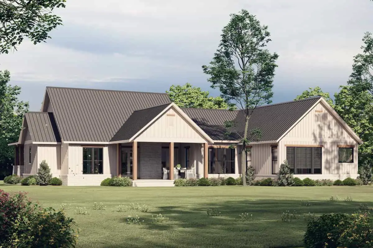 The façade gives off ranch-meets-craftsman energy: board and batten or light brick, strong timber details over the entry, and a metal or steep-pitch roof to anchor the look.