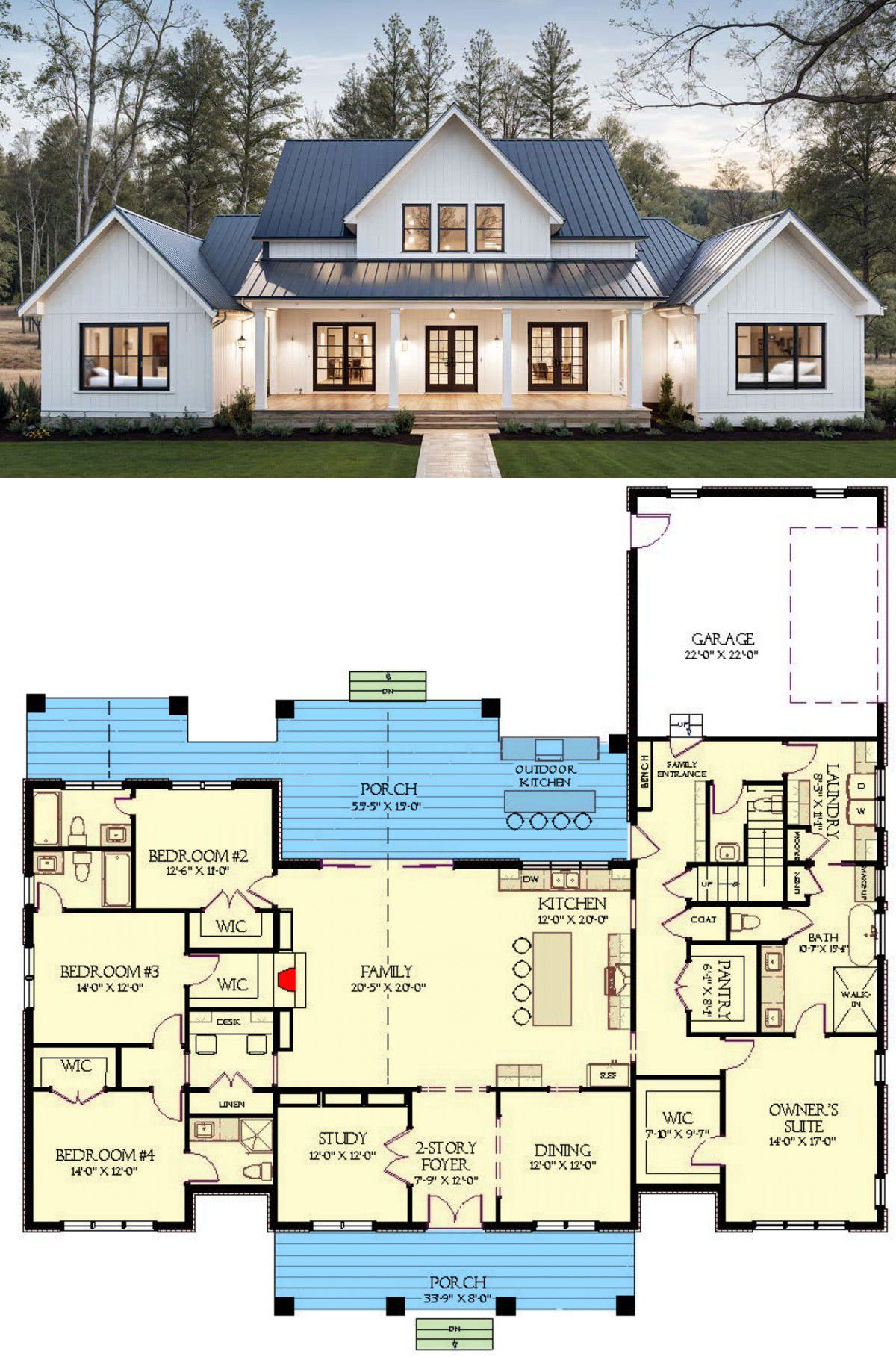 This modern farmhouse plan offers approximately 3,003 sq ft of heated living space, with 4 bedrooms, 4 full baths and 1 half bath.