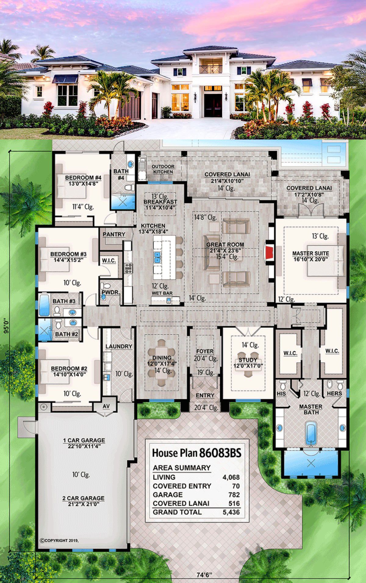 The width of 74′-6″ and depth of 95′-0″ give the home a strong yet relaxed presence.