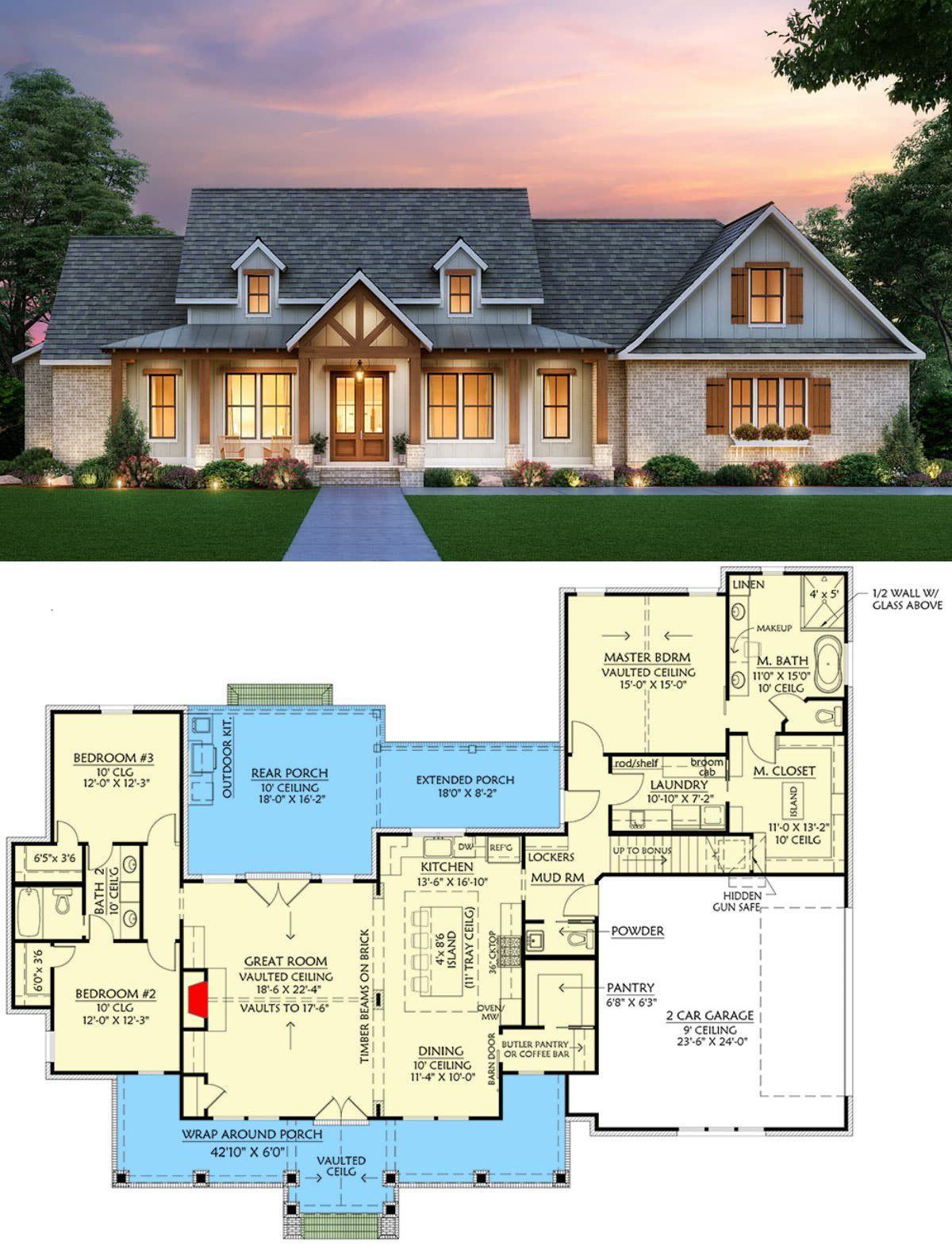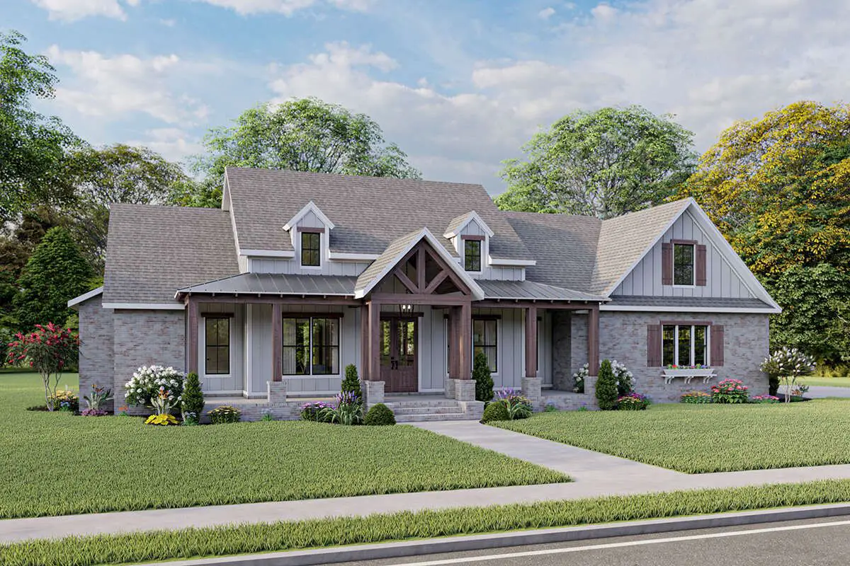 A delightful mix of brick and board-and-batten siding, wrap-around porch, and modern farmhouse detailing. 1