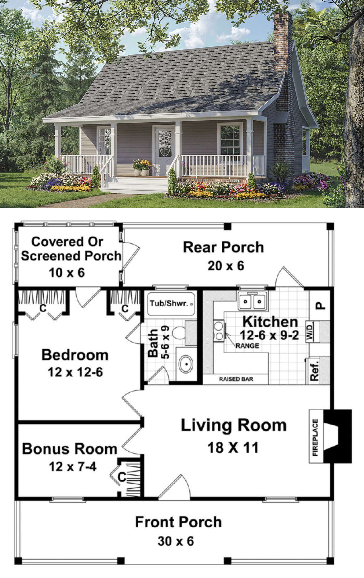 The front elevation is charming: a generous covered porch supported by beams and open railing provides outdoor living space that draws you in. The compact footprint (≈30′ wide × 32′ deep) means it works well on smaller or narrow lots. 2