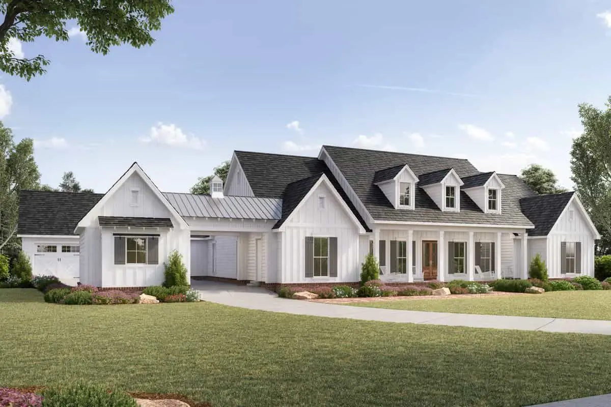 The façade brings board-and-batten or siding, neat dormers, and a welcoming front porch that gives the home a friendly, grounded look.