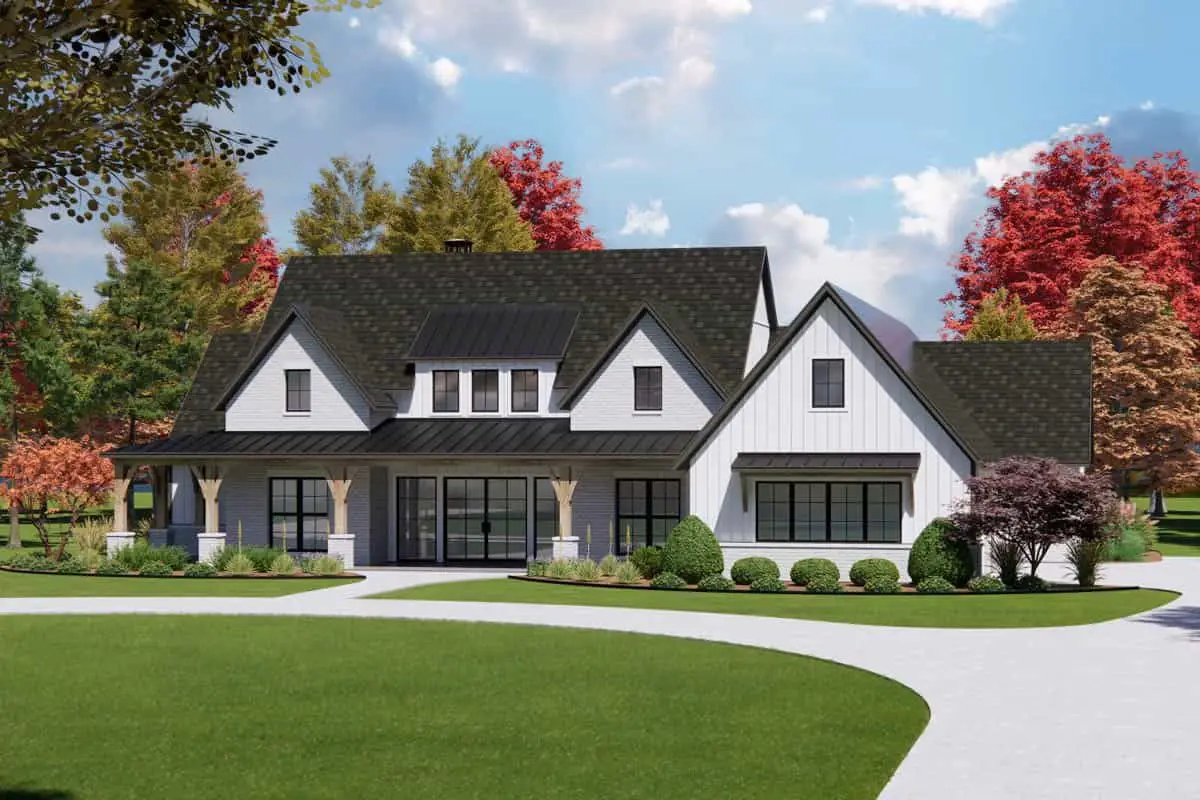 Two prominent gables flank three windows in a shed dormer above a six-foot deep front porch—giving welcoming farmhouse charm with modern flair.