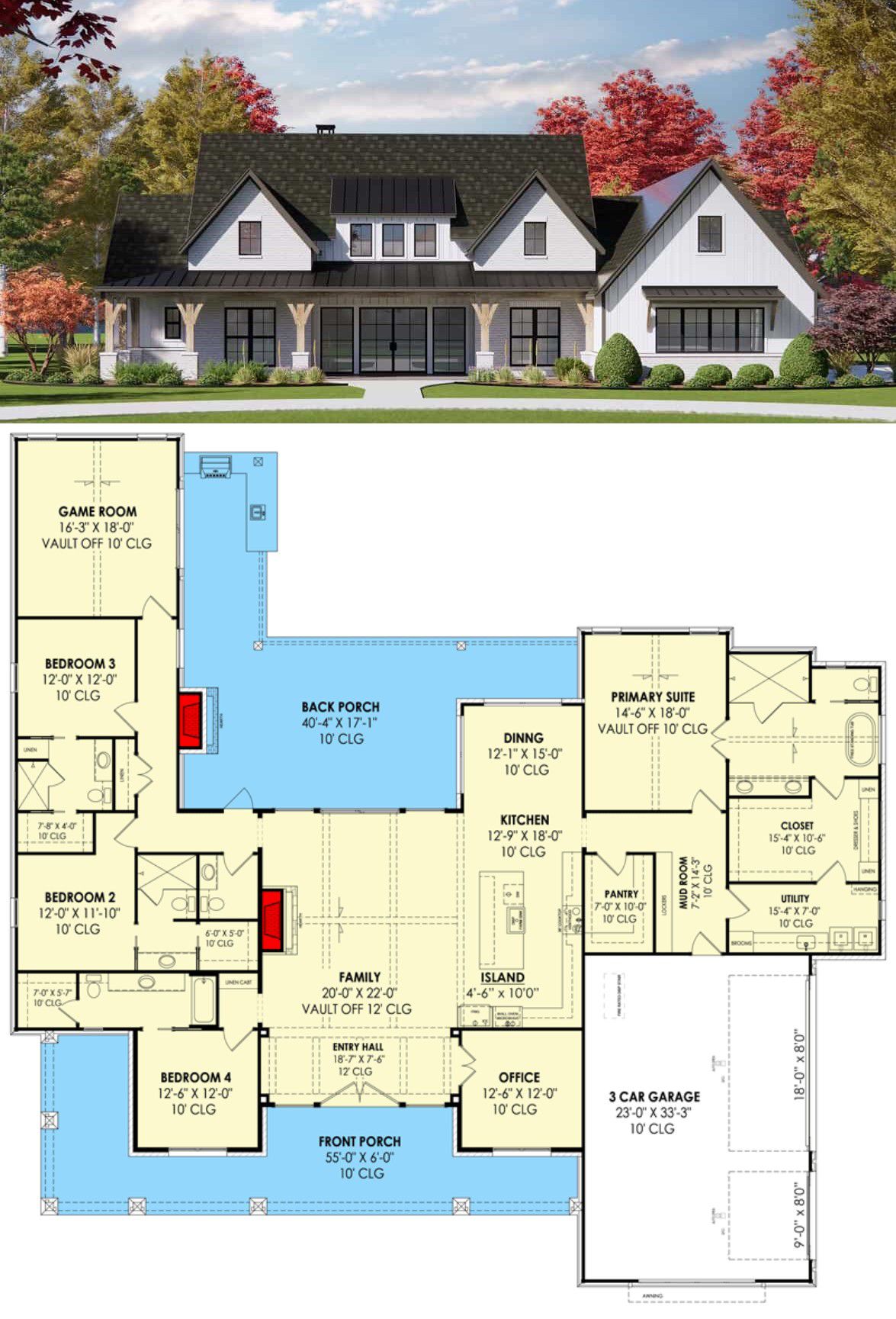 Three additional bedrooms line the left side of the home. A generous game room with a vaulted ceiling offers additional flexibility for study, play or media. 5