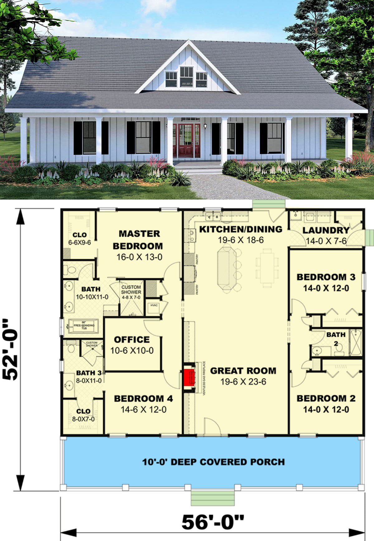 - Special Features: Decorative front gable, full-width front porch, home office/flex room, large kitchen island, open layout