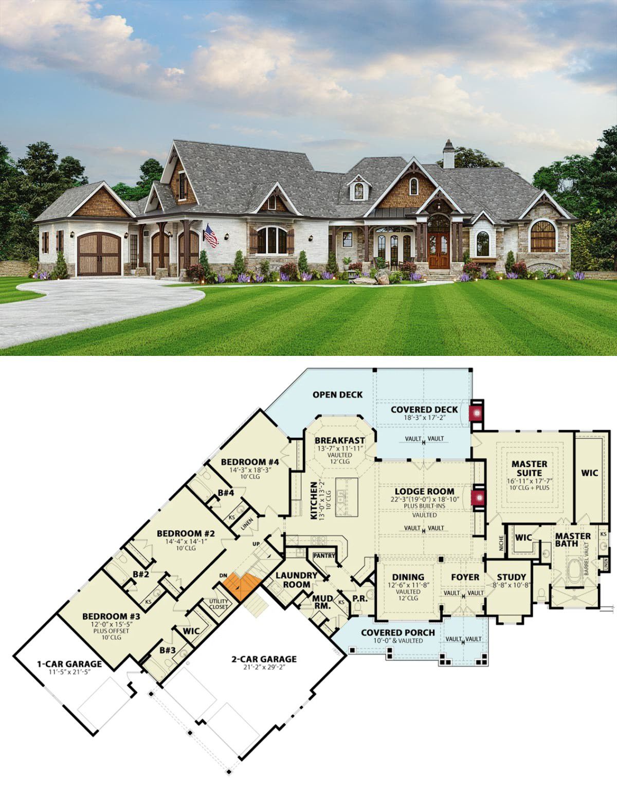The exterior brings the craftsman charm: mixed materials (brick/stone with shake siding accents), a broad front porch and layered rooflines.