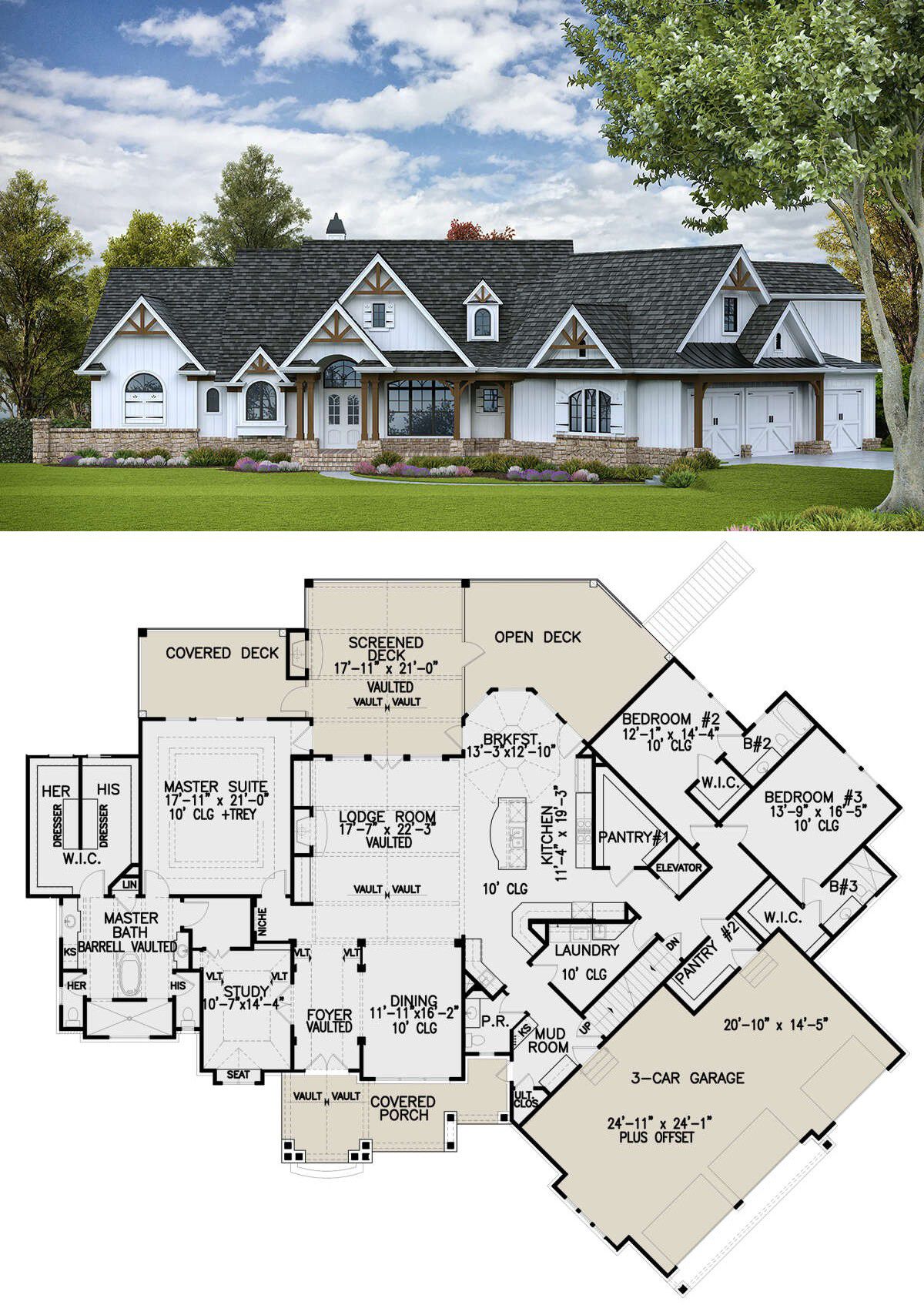 The main-level master wing affords privacy; the open lodge area accommodates family and guests; the additional upper suites (and optional elevator) future-proof the home.