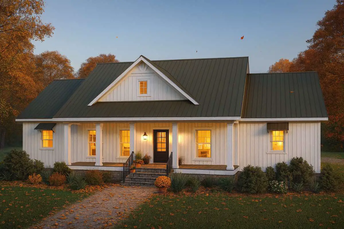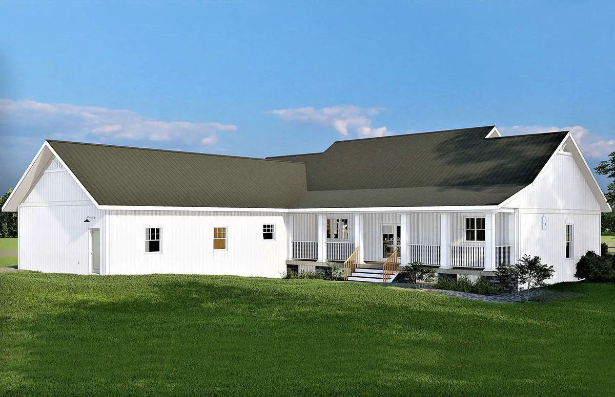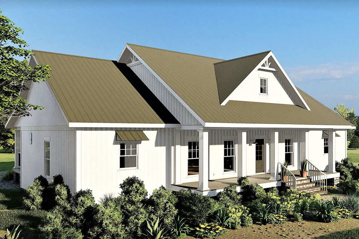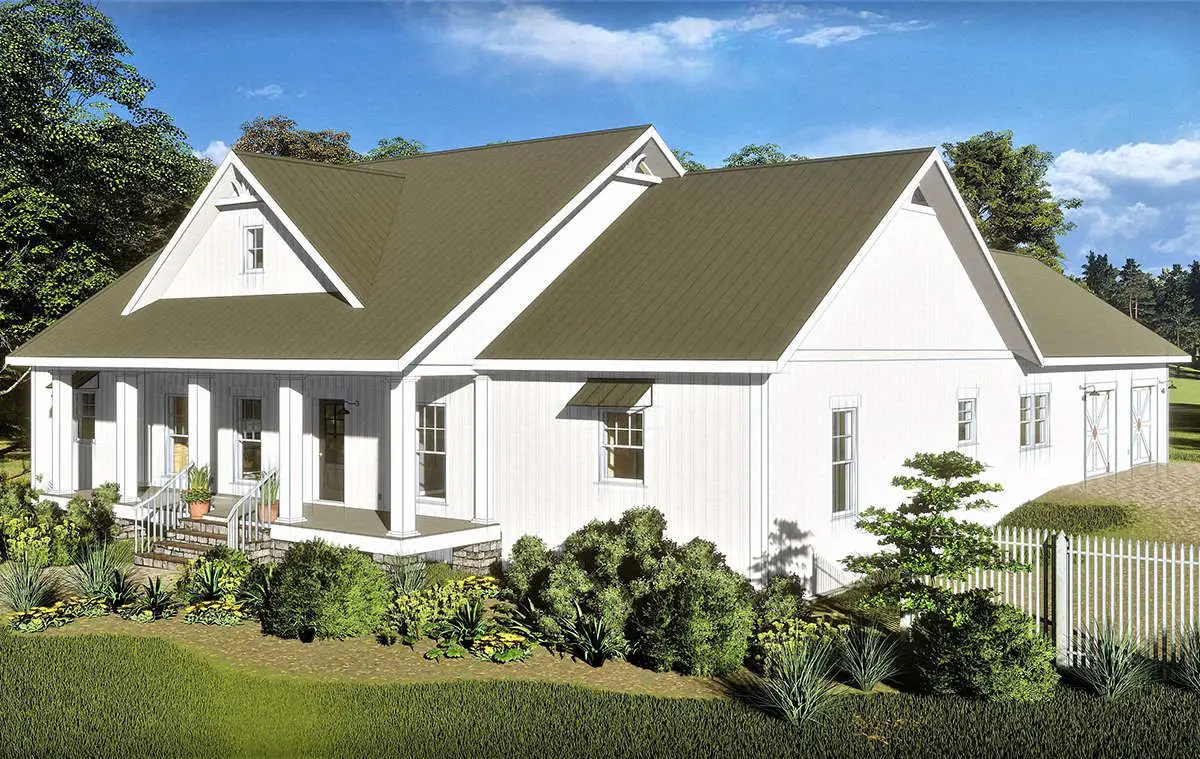 With its clean lines, prominent gables, and a generous front porch, this design nails modern farmhouse curb appeal.