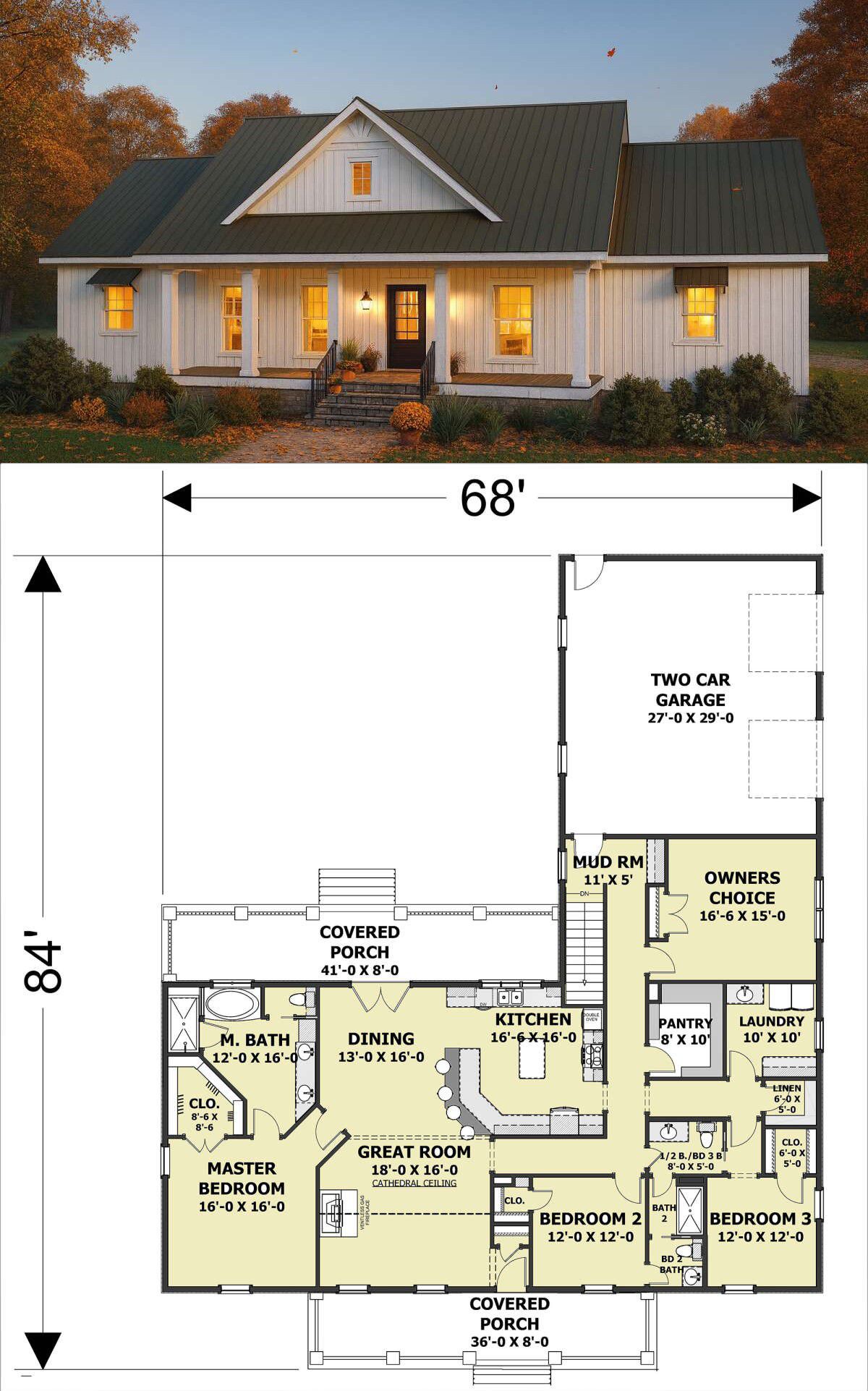The footprint (≈ 68′ wide × 84′ deep) offers practical scale without sprawling into excess.
