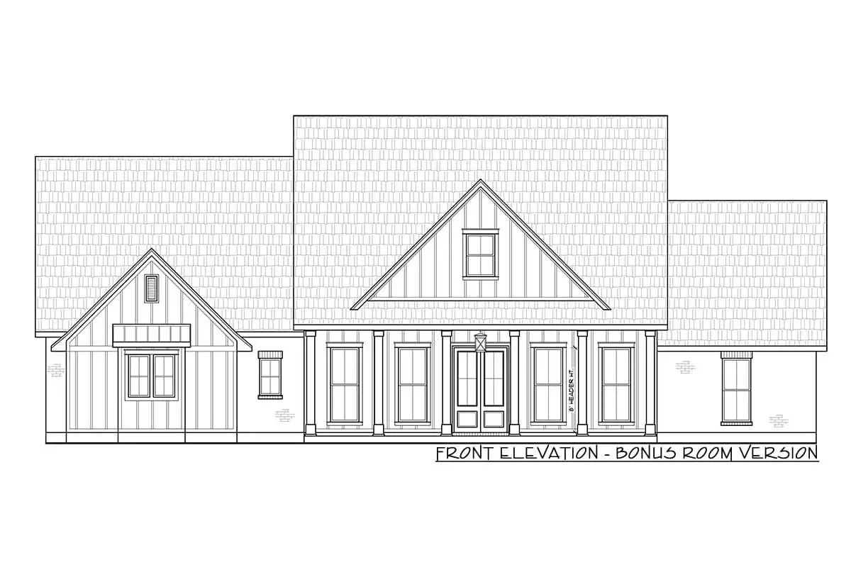 The façade brings together modern simplicity and farmhouse charm — board-and-batten siding (or a clean modern interpretation thereof), a welcoming covered front porch, and a roofline with character. It feels calm, intentional, and built for easy living.