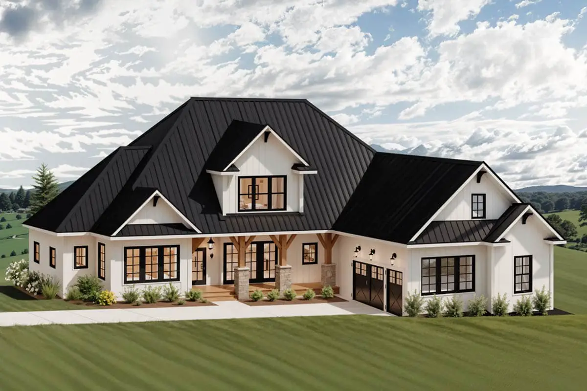 A covered entry porch topped with a large centered gable sets the tone — classic craftsman lines, strong presence, and a warm invitation. A courtyard-entry, three-car garage anchors the side, giving both functionality and curb balance.