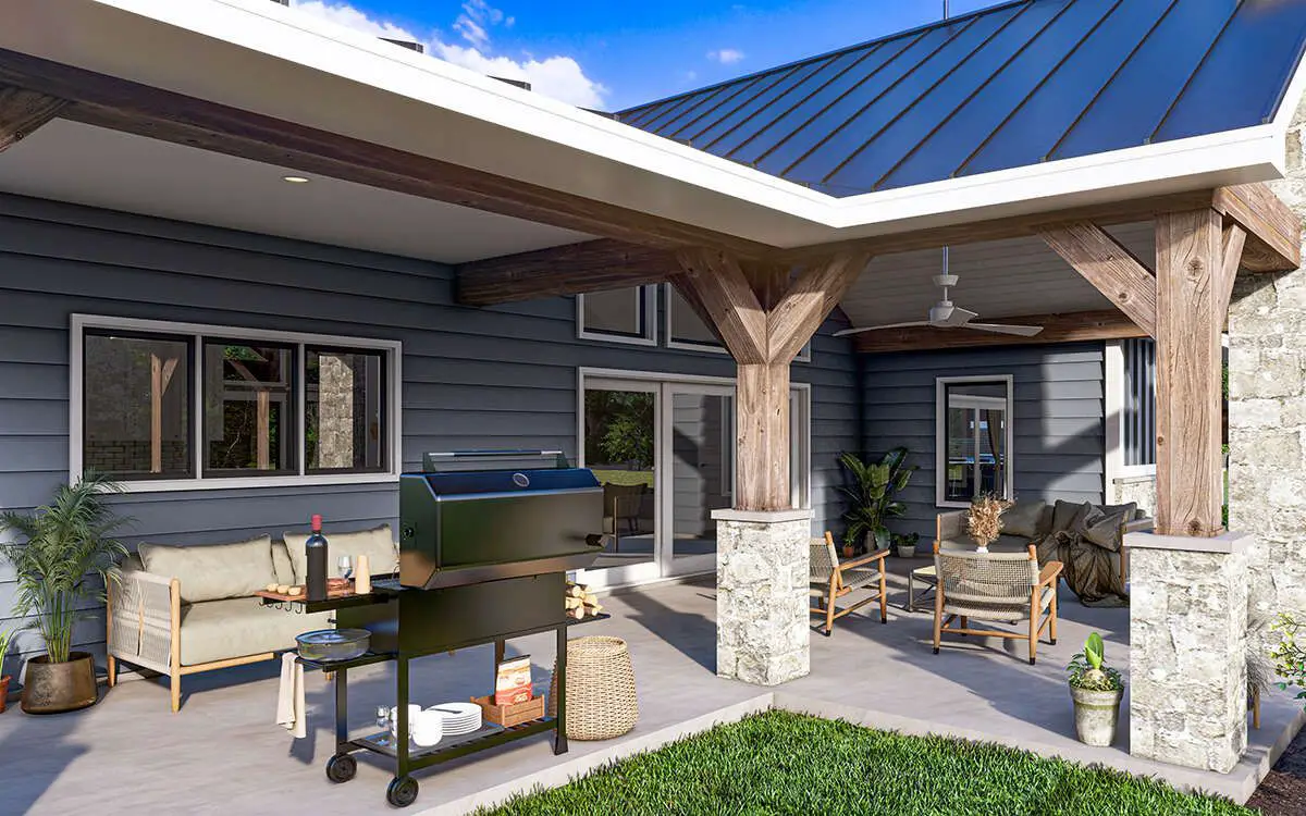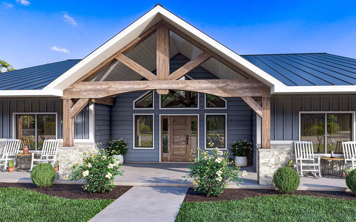 The exterior makes a strong first impression—features include vertical siding, stone-accent columns, exposed timber beams at the front covered porch, and a large gable that adds scale and character.