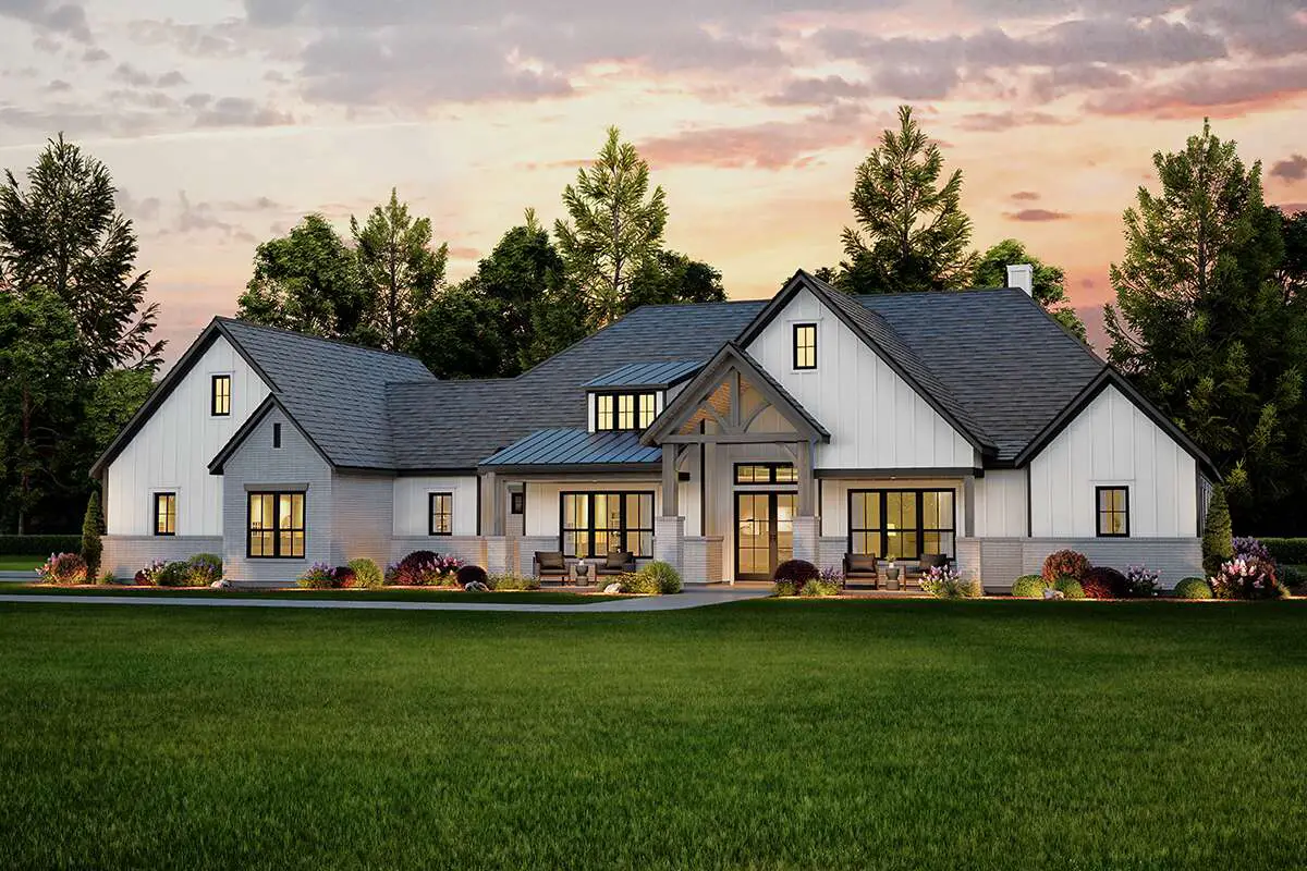 The exterior brings crisp board-and-batten siding, a steep 8:12 roof pitch, and a broad span of roughly 98′-wide by 81′-10″ deep—creating strong presence without overwhelming scale.