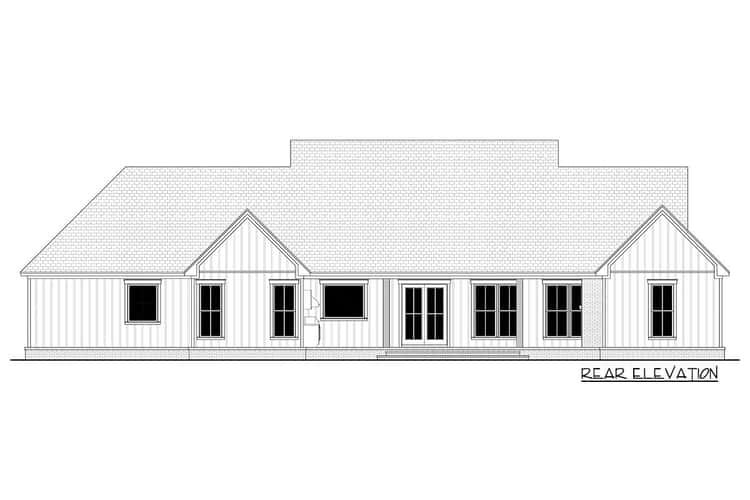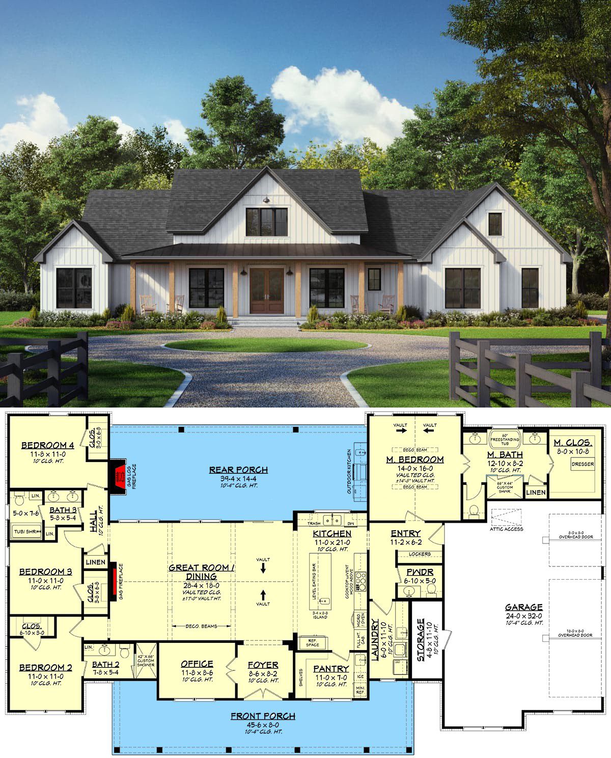 This stylish farmhouse plan offers approximately 2,500 sq ft of heated living space on one level, featuring 4 bedrooms, 3 full baths plus 1 half-bath, an attached 3-car garage (~802 sq ft), a dedicated office, and generous outdoor living areas including front and rear porches.