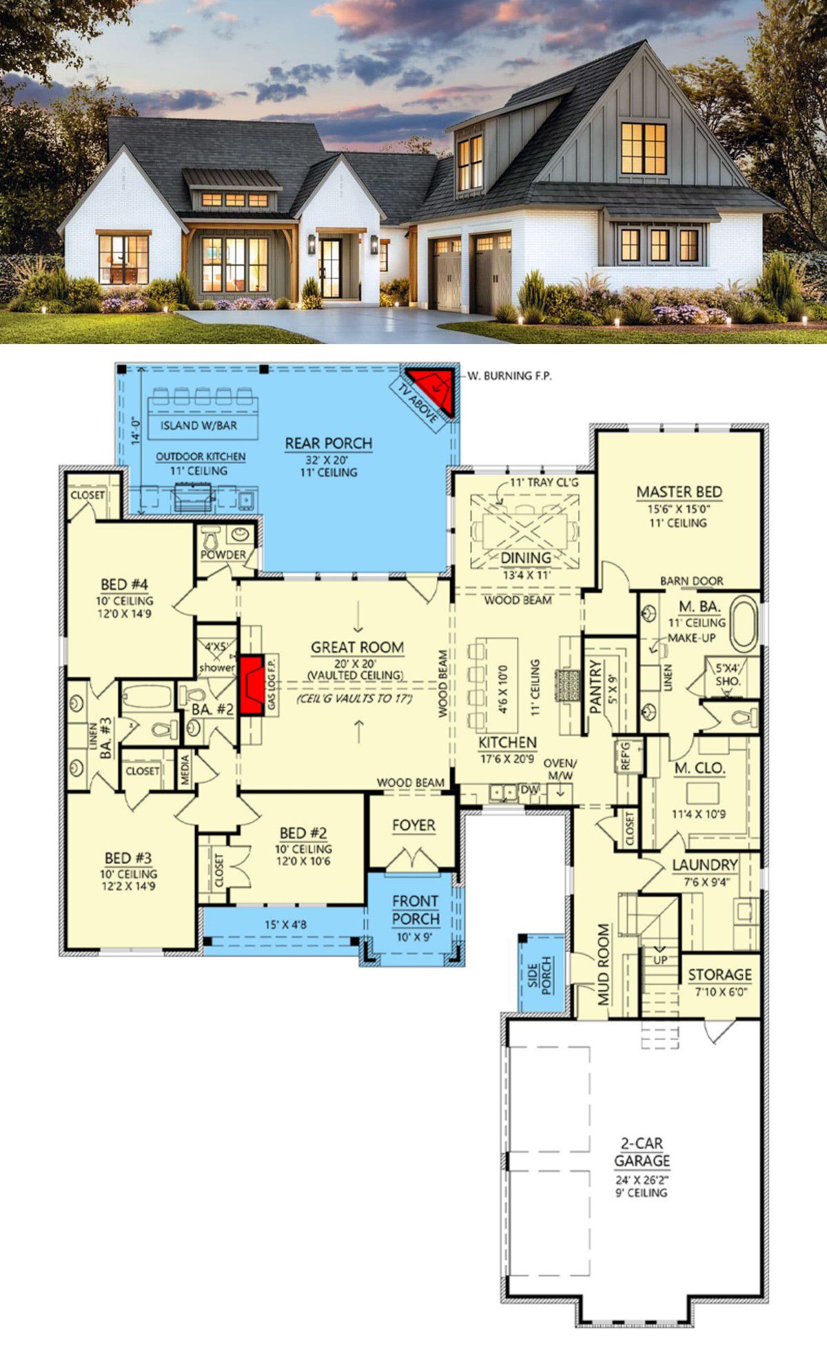 With about 2,768 sq ft of heated living space, this single-story layout includes 4 bedrooms, roughly 3.5 baths, a dramatic two-story great room, and a covered rear porch outfitted with an outdoor fireplace and wet bar.