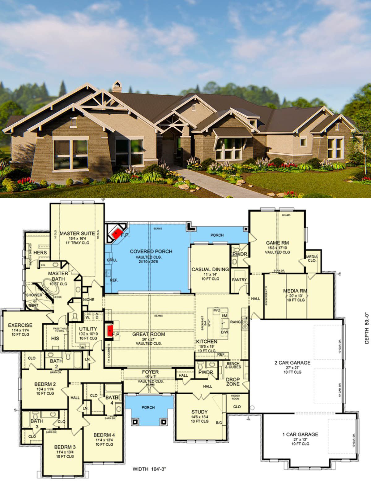 This roomy, single-story Craftsman plan offers about 4,420 sq ft of heated living space, including **4 bedrooms**, **4 full baths**, and **1 half bath**.