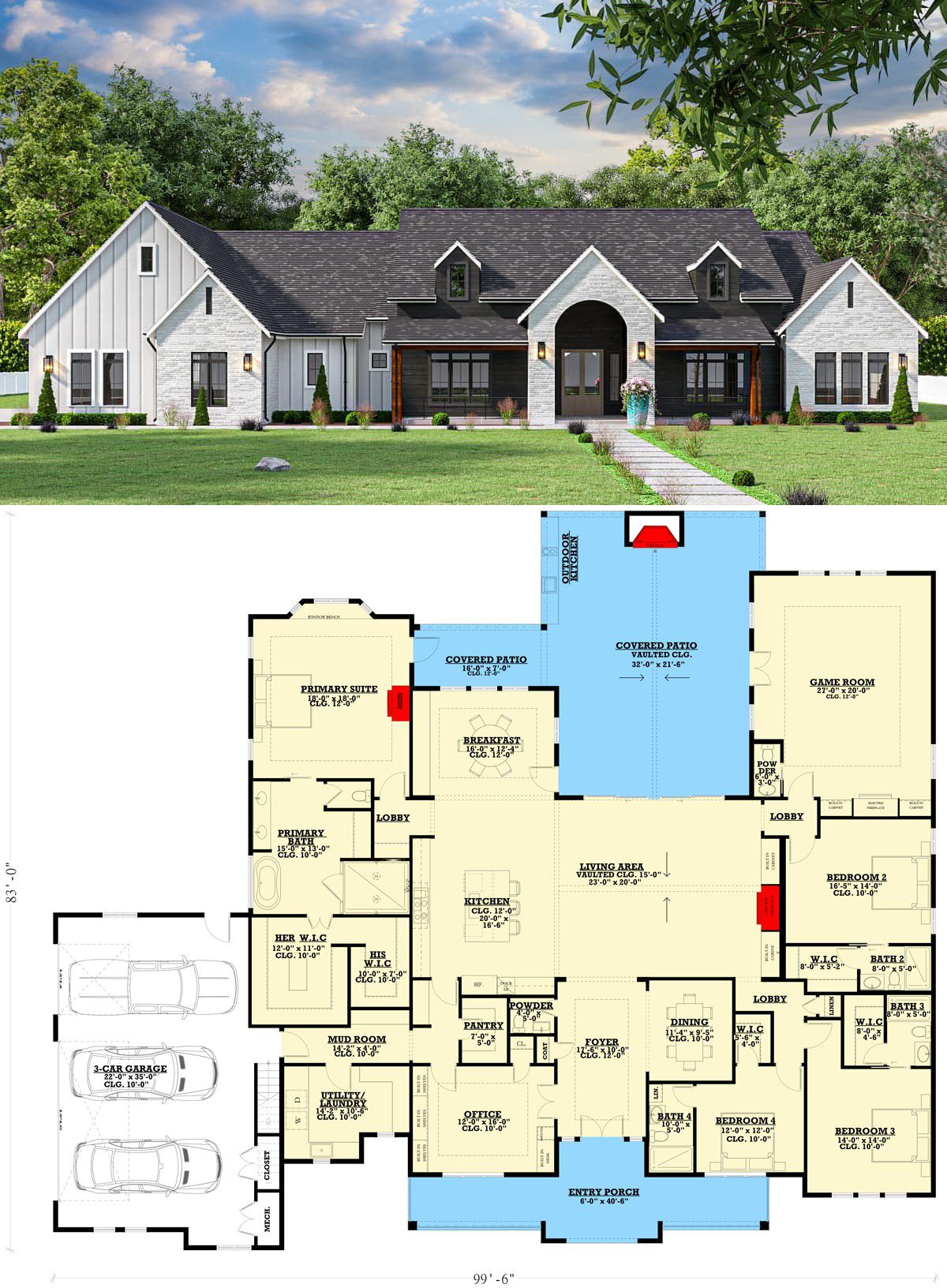 This design marries scale and style beautifully: large gathering zones, private wings, and a dedicated space for entertainment make it perfect for families who love to host—and live broadly. The transitional look keeps it fresh, while classic farmhouse elements make it enduring.