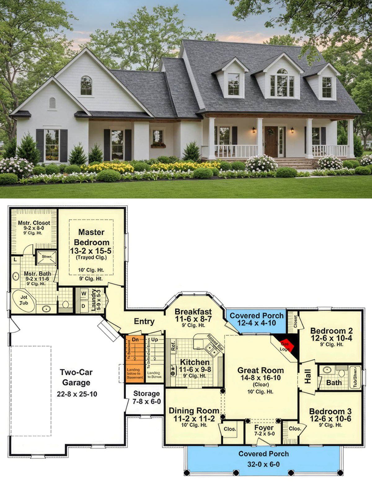 The design has classic farmhouse vibes—clean lines, a welcoming front porch (192 sq ft), and traditional white siding balanced with dark shutters.