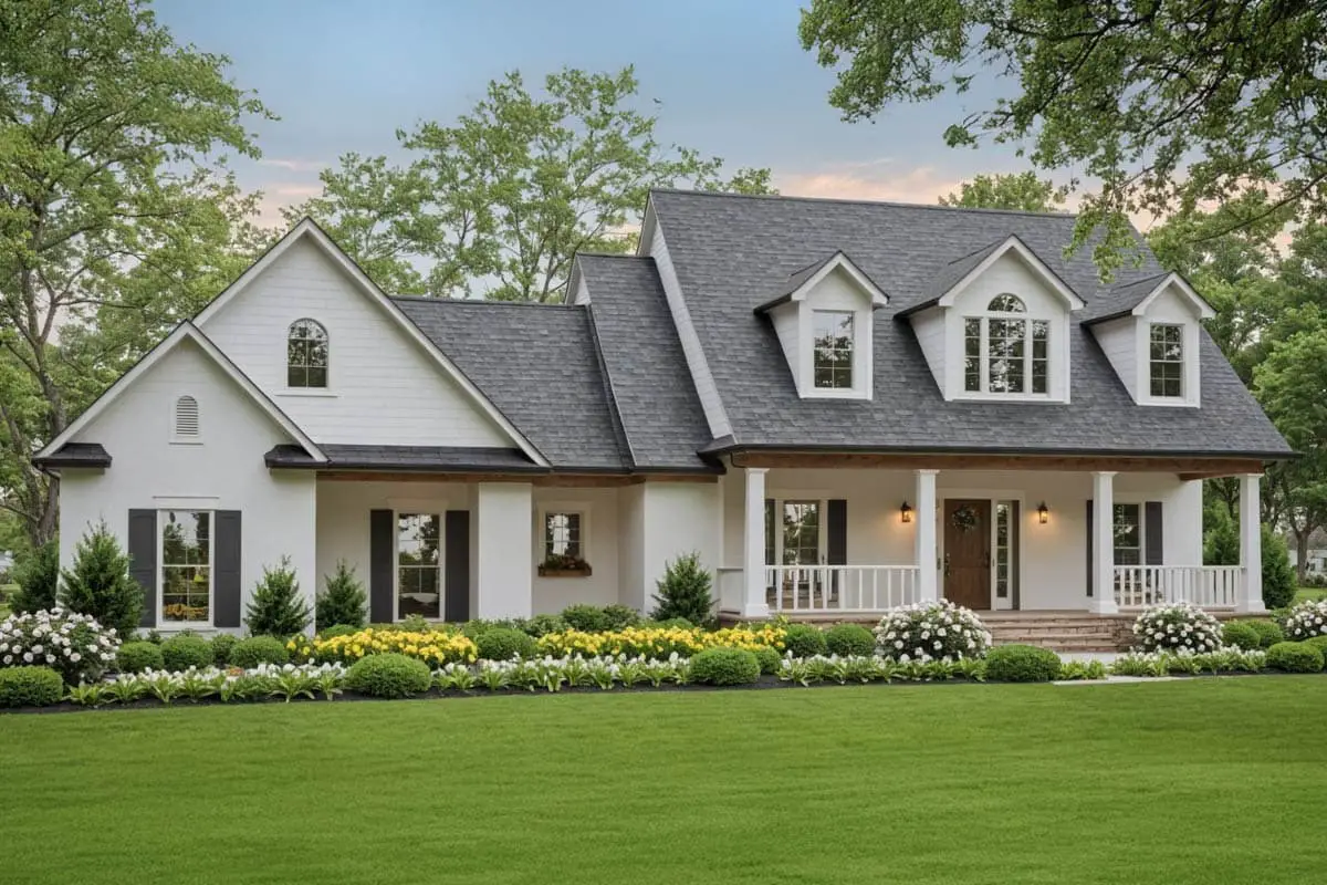 The design has classic farmhouse vibes—clean lines, a welcoming front porch (192 sq ft), and traditional white siding balanced with dark shutters.