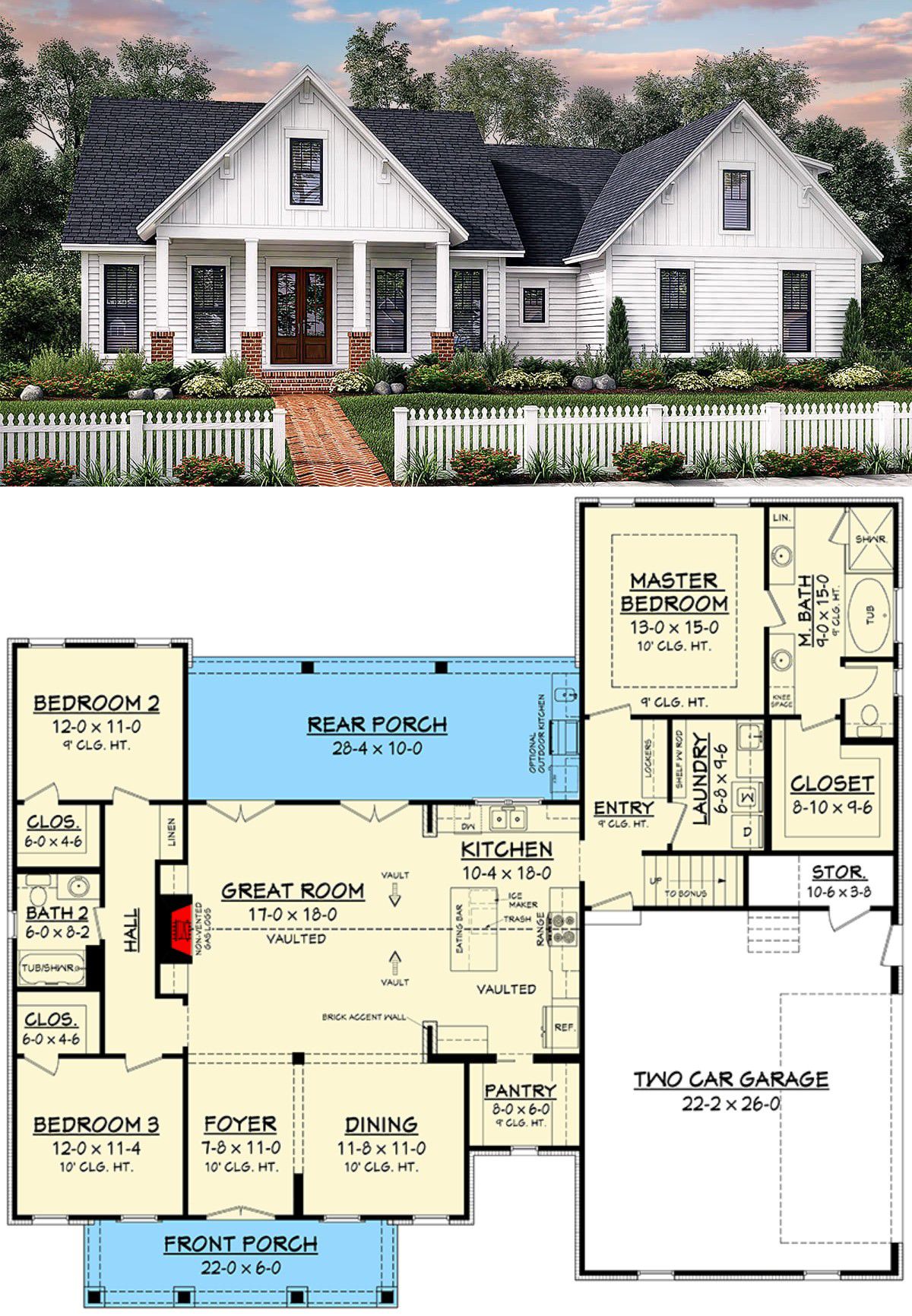 This charming, efficient farmhouse packs a lot into just 1,988 sq ft — with 3 bedrooms (or 4 if you finish the bonus room), 2–3 baths, vaulted ceilings, and a side-entry 2-car garage.