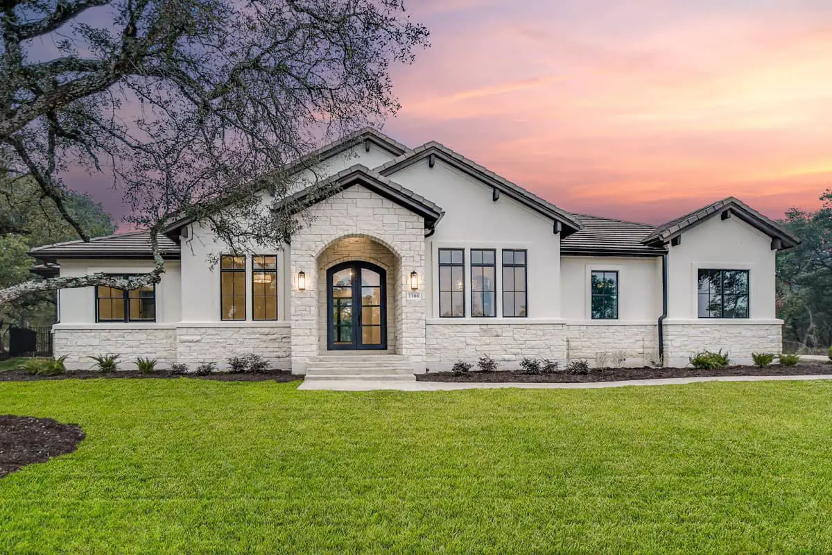 The façade mixes stone and stucco, accented by wide bracketed eaves and large windows—giving the home a strong but welcoming hill-country feel.